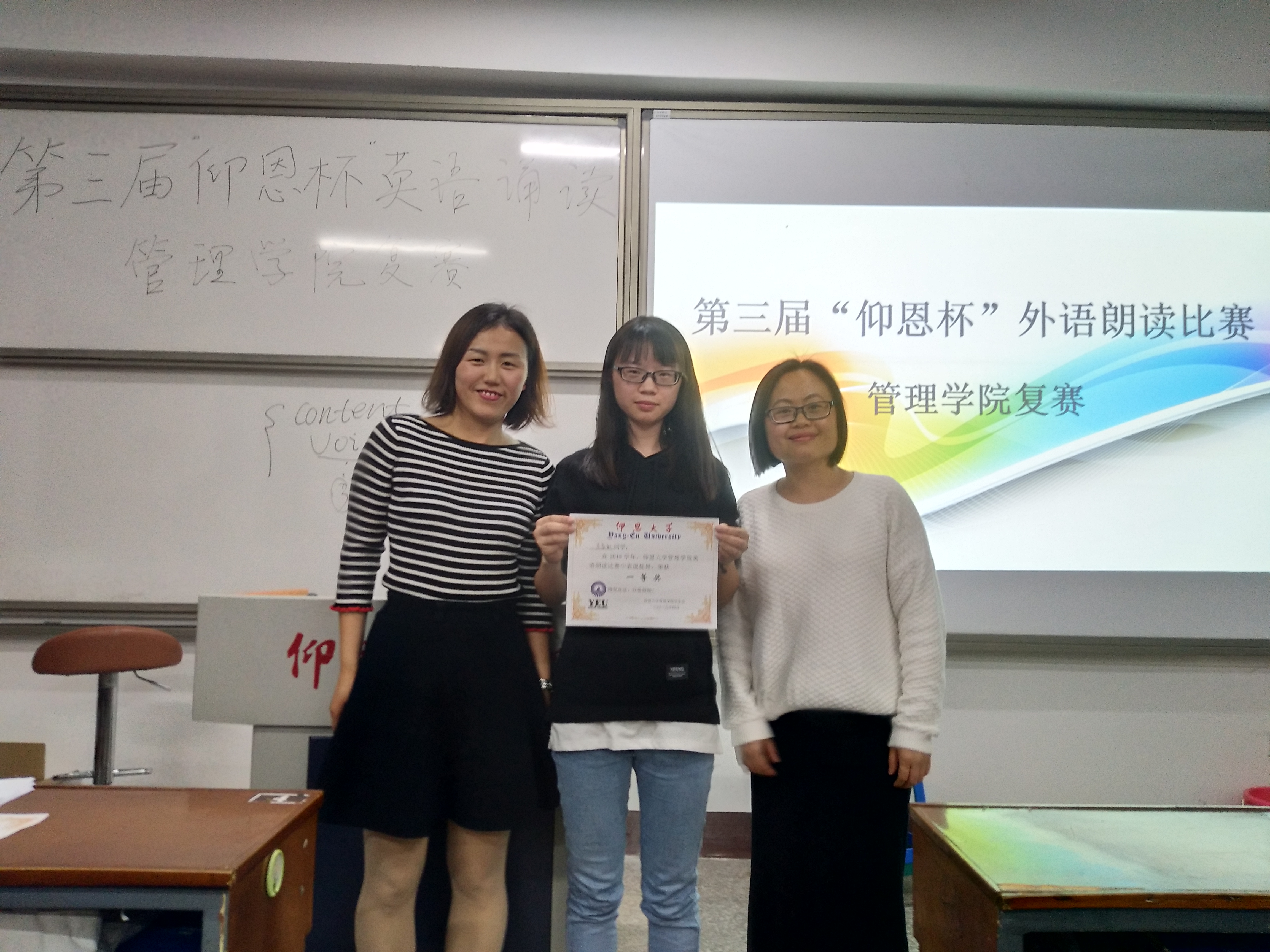 本次比赛吸引了我院35名同学报名,在比赛中他们以自信十足的姿态,流利的口语,声情并茂的朗读博得了台下评委和观众的阵阵掌声。最终,吴益敏以94分的高分荣获一等奖,陈睿琦、黄怡获得二等奖。届时,这三位同学将代表我院参加外语诵读比赛半决赛。