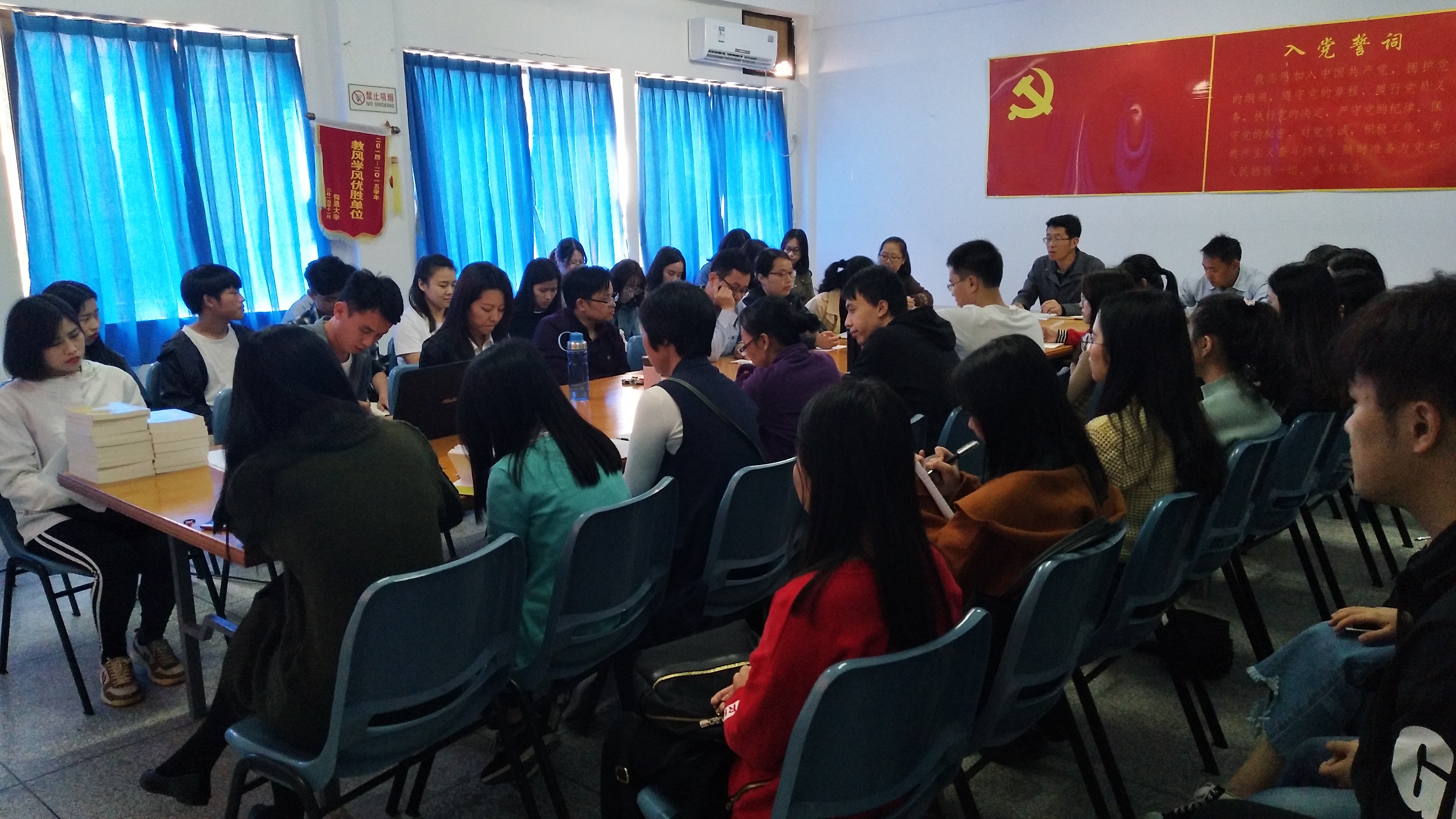 会中,许惠铭还就我院在新学期推进“党建创强”创新工作方式与方法和大家进行了交流。对新成立的ac米兰官网中文网站新闻宣传中心推出的“你好管院”微信公众号中语音播报“时政理论早班车”栏目和对建立“挂牌上岗”制,推行“党员示范查课”的举措以及为方便广大师生党员学习宣传贯彻党的十九大精神精心设计的“党员小书包”表示肯定,鼓励大家要创新学习方式,同时坚持把学习党的理论知识常态化、制度化,要在学习中提升自我政治理论水平,共同提升我院党员队伍素质,并在教学、科研、学习和工作上积极发挥党员先锋模范作用,争取取得更加优异的成绩。