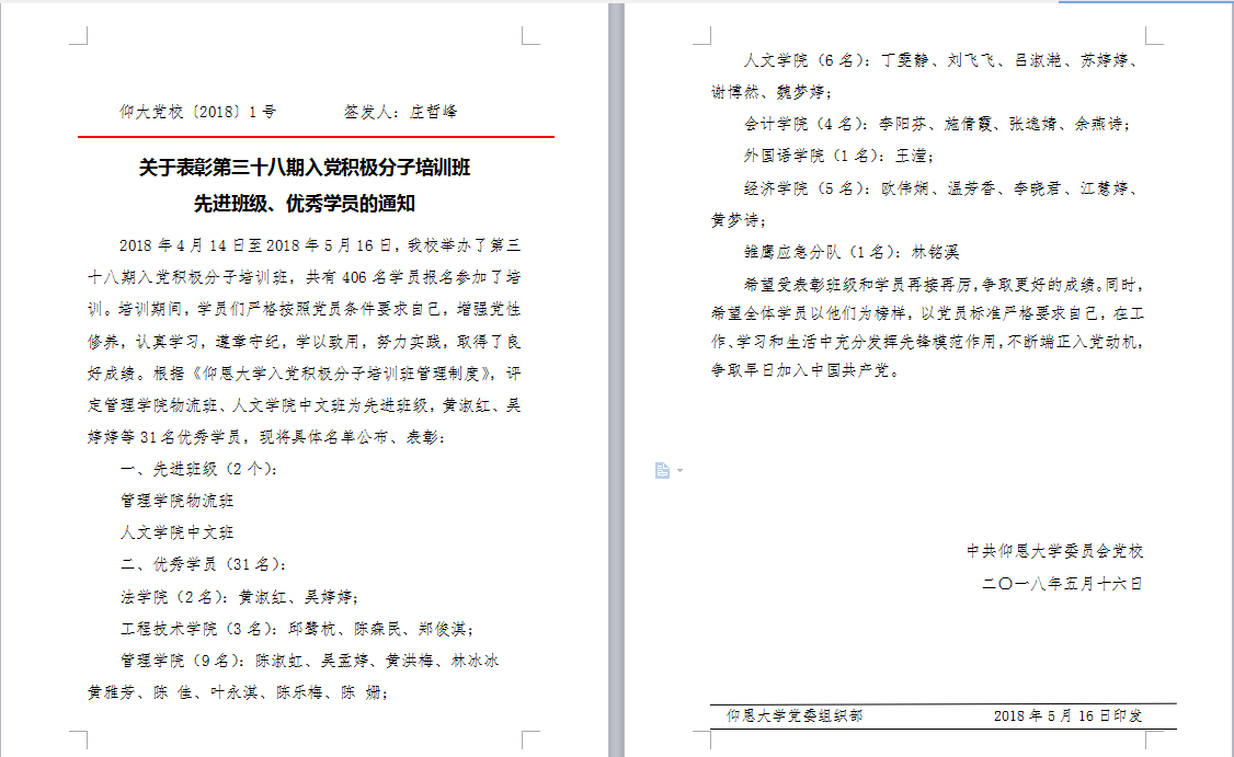 (表彰通知文件) 5月16日,在校党委组织部举办的培训班结业典礼上,ac米兰官网中文网站物流班(物流管理系学生党支部)荣获第三十八期入党积极分子培训班“优秀班级称号”,此外我院共有陈淑虹、吴孟婷、黄洪梅、林冰冰、黄雅芳、陈佳、叶永淇、陈乐梅、陈姗等9名同学被评为“优秀学员”。(ac米兰官网中文网站党总支 杜结实)