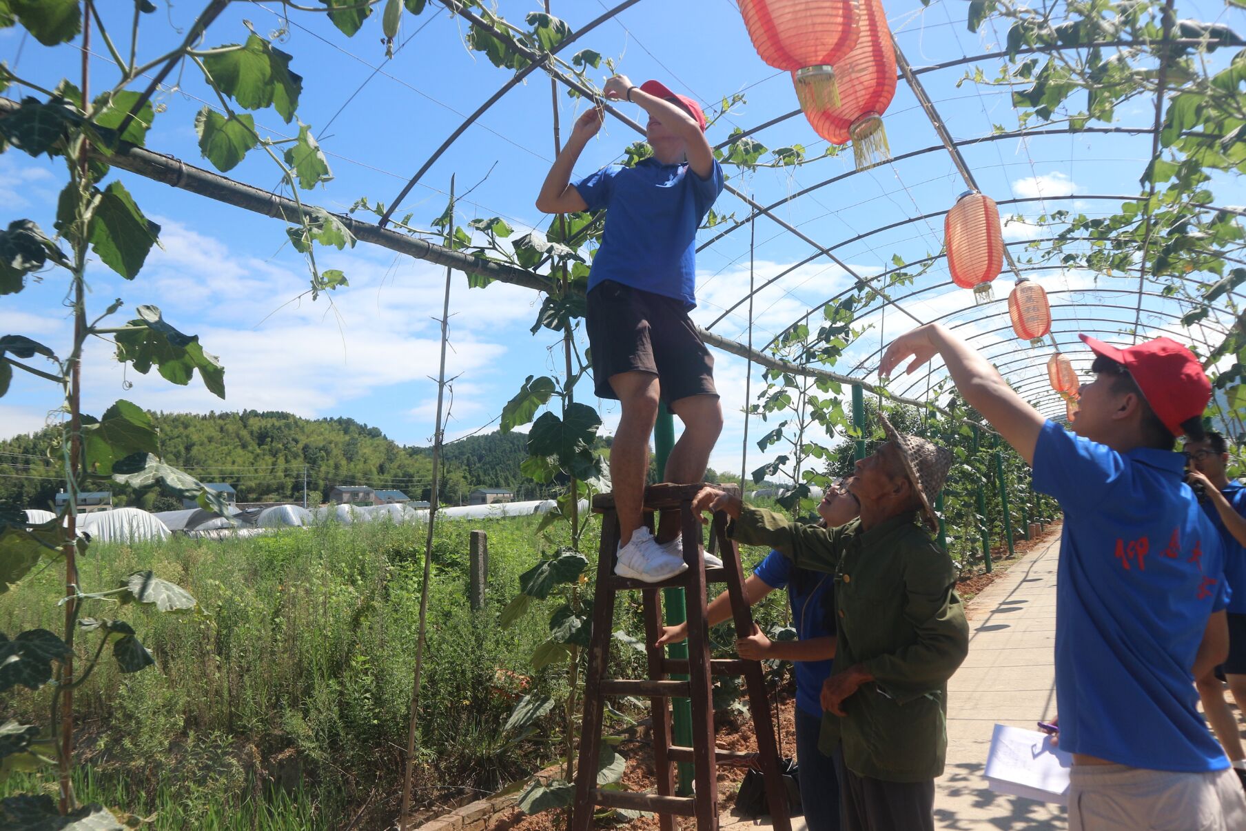 【ac米兰官网中文网站“青溢功成队”赴福建省南平市顺昌县张墩村暑期实践队】队员们同村民一起修建瓜藤