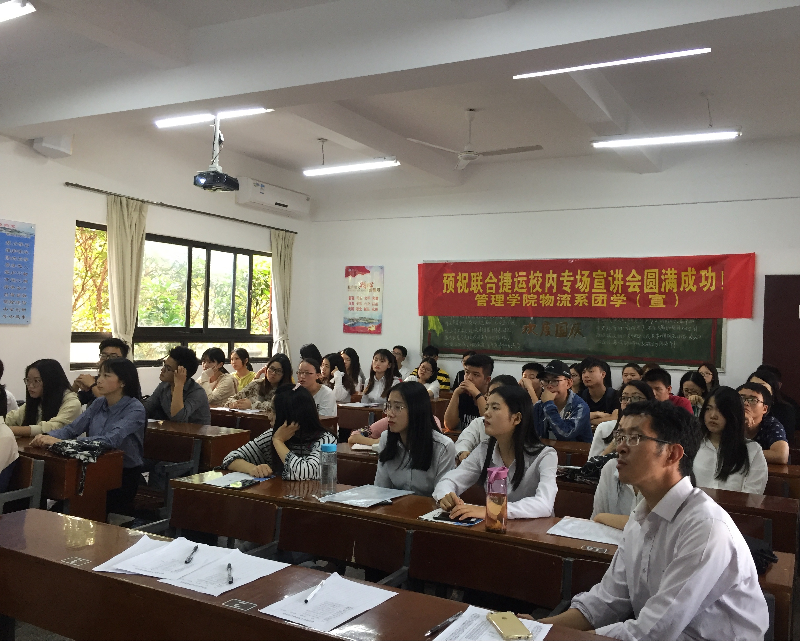 招聘宣讲会现场 在招聘宣讲会上,黄忠彬先生通过PPT放映,讲述了公司的企业结构、招聘岗位、企业文化等内容。在互动环节中,通过提问应届毕业生们更加具体的了解了公司的发展现状和前景,也对自己想要应聘的岗位有一定的认识和了解。绝大多数到场的应届毕业生都投递了个人简历,联合捷运物流有限公司则对投递简历的毕业生现场笔试。