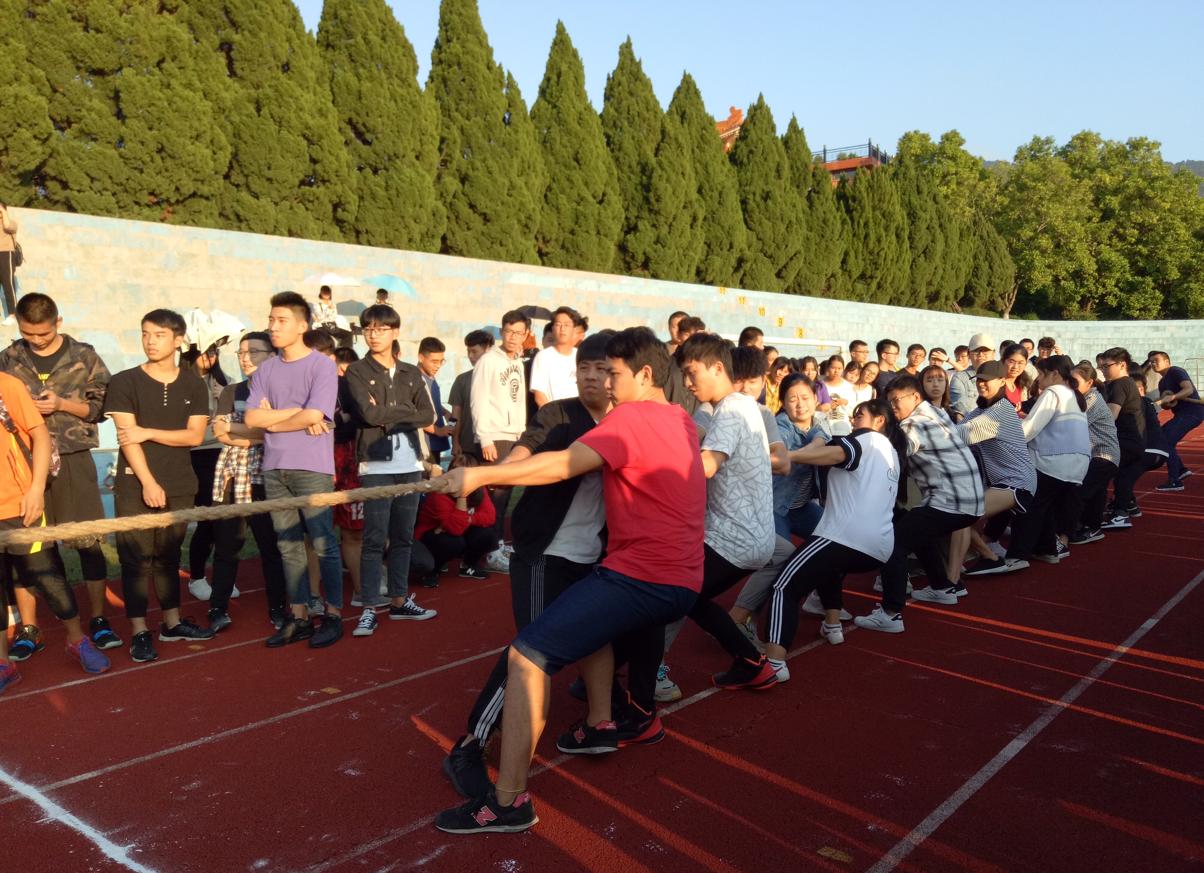 比赛实况 本次拔河比赛的参赛队伍以系为单位进行,经过抽签,第一场比赛由公共管理系对战英语系。当比赛的哨声一响起,两边队员都整齐的往后倒、向后退,绳子中间的红线左右摇摆,各系的同学们自发组成啦啦队为本系队员加油,队员们拼劲了全力,比赛僵持了几分钟,最终公共管理系获得第一场比赛的胜利。接着,公共管理系队员们齐心协力,经过耐力和体力较量,最终公共管理系获得拔河项目比赛第六名的好成绩。