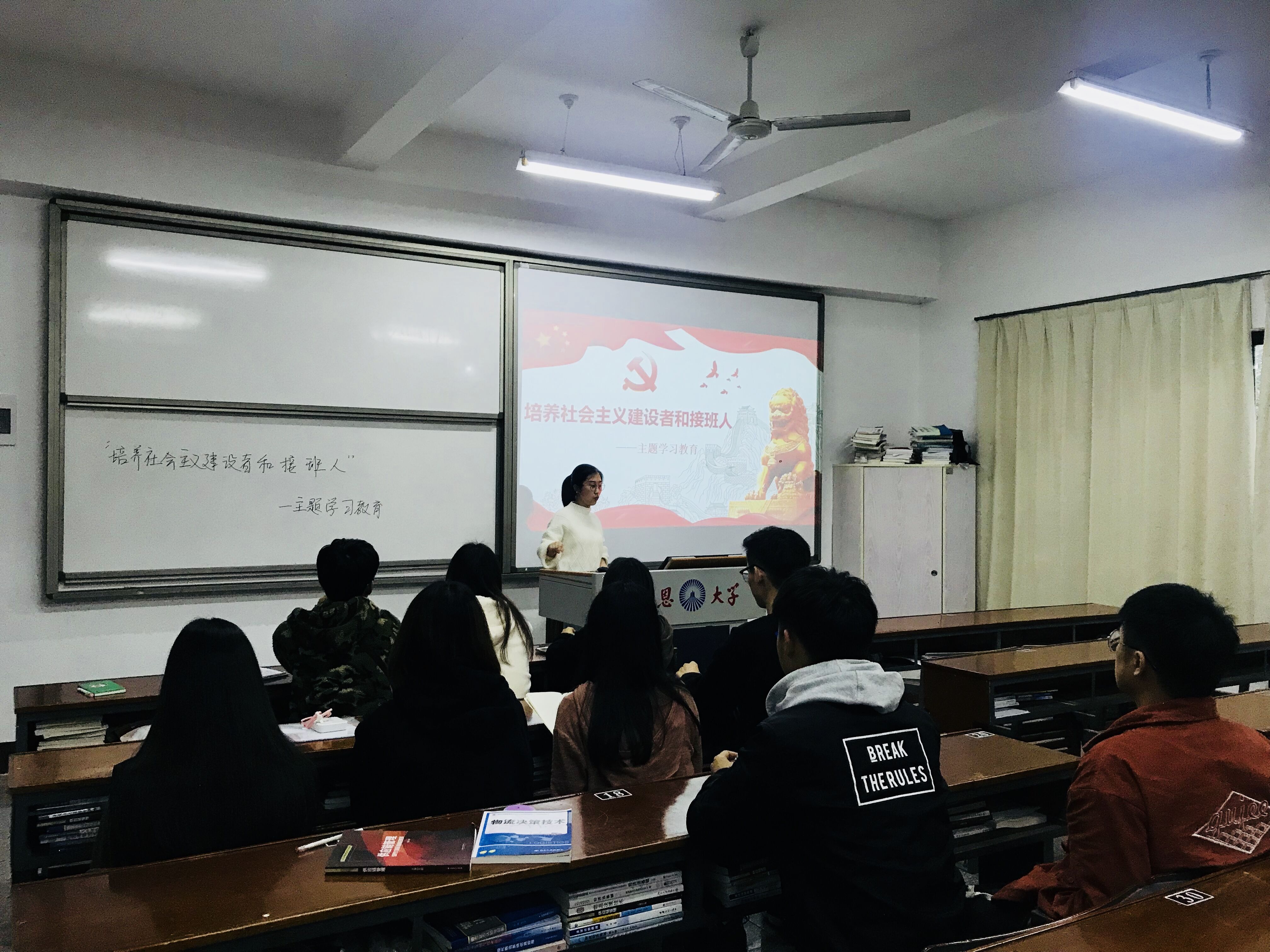 宣传委员组织学习教育 本次活动由物流管理系学生党支部宣传委员纪鑫容同志主持,支部全体成员参加。纪鑫容同志为大家解读习近平新时代中国特色社会主义思想、党的十九大和十九届二中、三中全会精神,明确教育发展目标;重点组织研讨“六个下功夫——要在坚定理想信念上下功夫,要在厚植爱国主义情怀上下功夫,要在加强品德修养上下功夫,要在增长知识见识上下功夫,要在培养奋斗精神上下功夫,要在增强综合素质上下功夫”;并围绕“培养什么人、怎样培养人、为谁培养人”展开讨论,引领大家树立坚定理想信念,践行社会主义核心价值观,塑造优良班风学风,努力把自已锻造成为社会主义建设者和接班人。