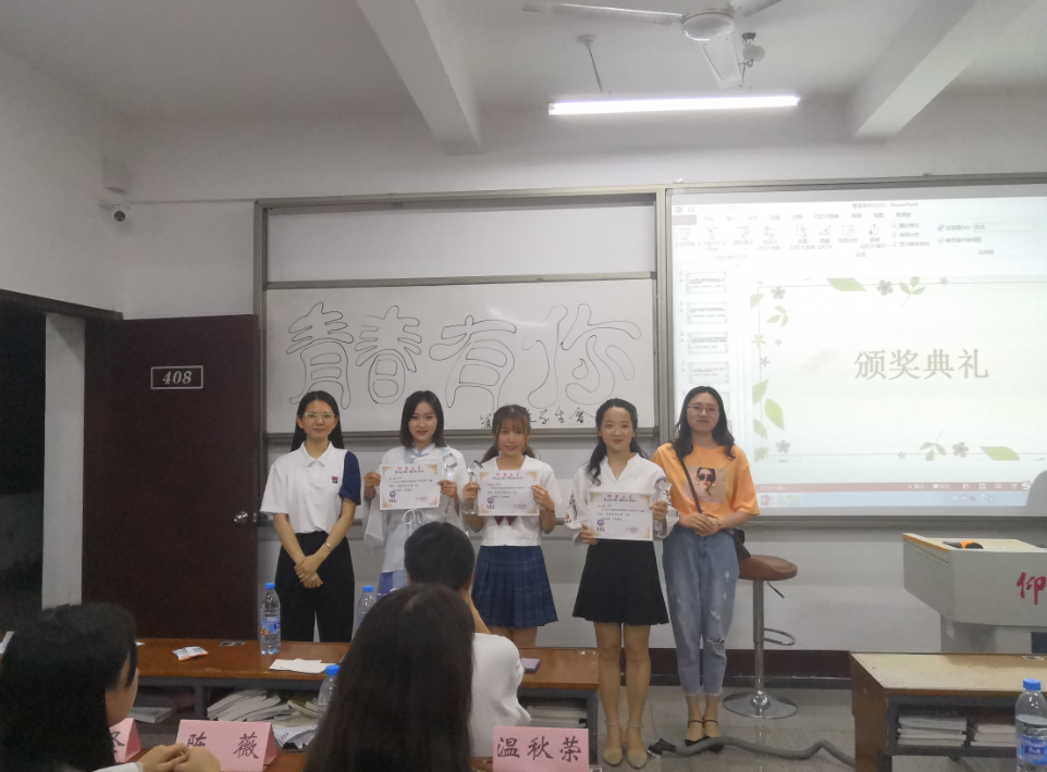 颁奖 徐鸿飞老师在总结中,对选手们精彩的表现给予了肯定,并表示青春的样子就该是在有限的青春内作出正确的选择。最终,张锦蓉、黄少敏、张文静同学分获冠、亚、季军。刘傲霜等11位同学荣获“青春宣传大使”称号。(胡莹/文 秦祥钦/图 审核:杜心田)