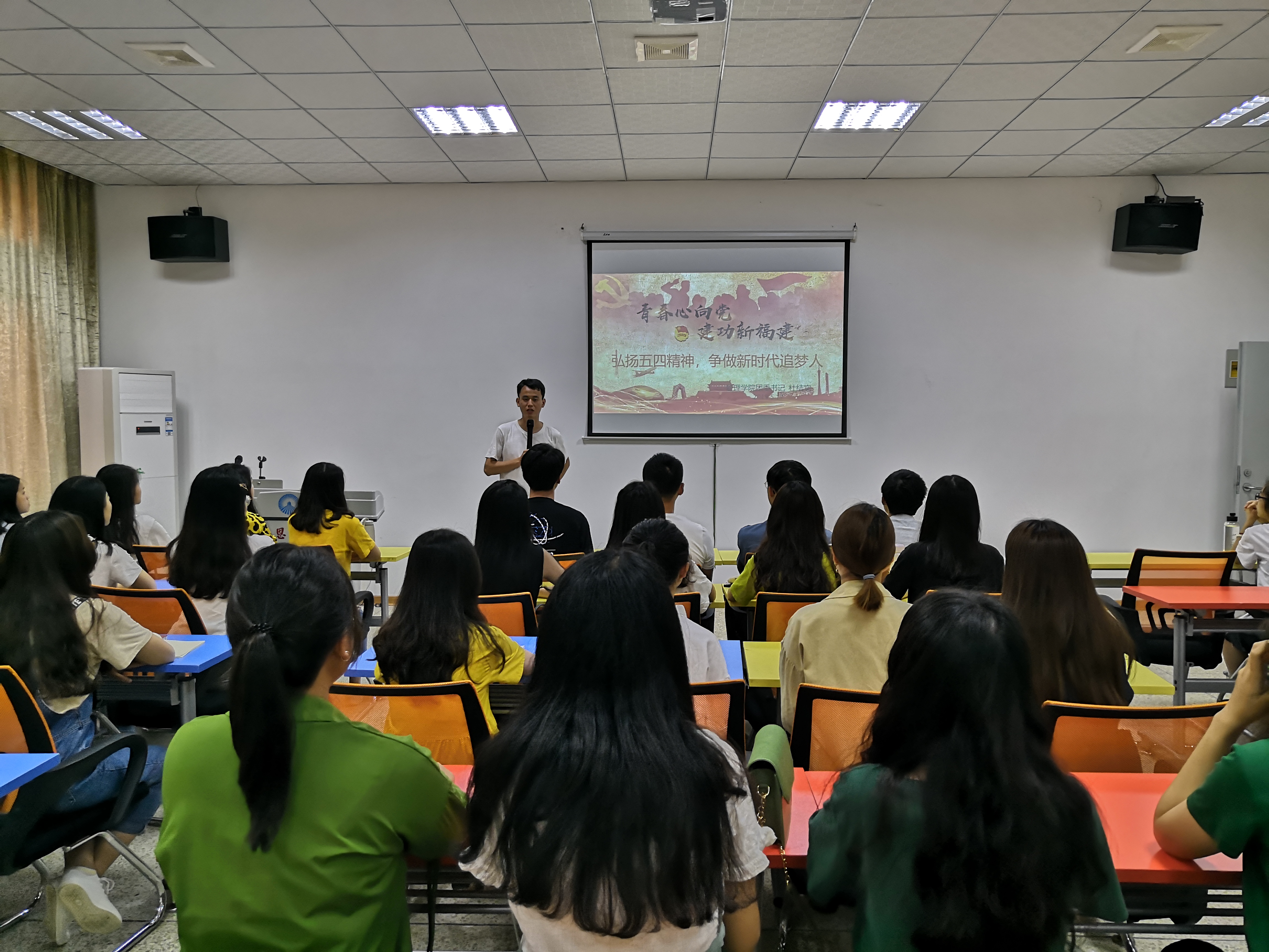 5月17日上午,以“青春心向党·建功新福建”为主题的“青马之光”主题宣讲活动ac米兰官网中文网站宣讲会于第一教学区创业园培训室举行。本次活动由我院团委书记杜结实主讲《弘扬五四精神,争做新时代追梦人》,2016级工商管理1班团支部全体成员到场聆听。