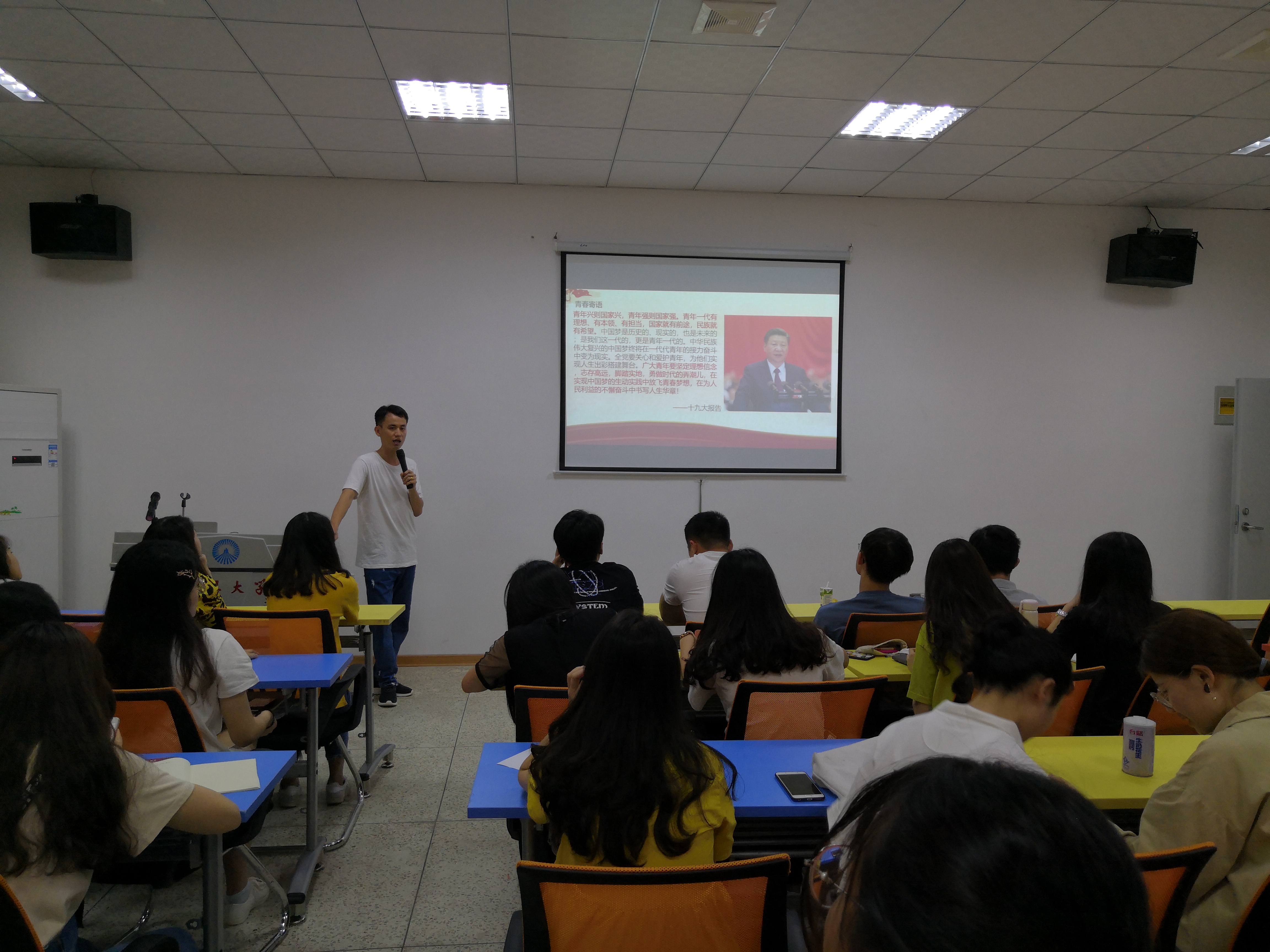 宣讲现场 杜结实主要围绕“重温峥嵘岁月”、“解读五四精神”、“弘扬五四精神,争做新时代追梦人”等三个方面展开,同时结合习近平总书记在党的十九大、纪念五四运动100周年大会等会议上的重要讲话精神进行讲解。他通过播放《我的1919》节选视频,带领2016级工商管理1班团支部青年团员回顾五四运动的光辉历程,在声情并茂的宣讲中加深了团员青年们对“五四精神”的认识和理解。