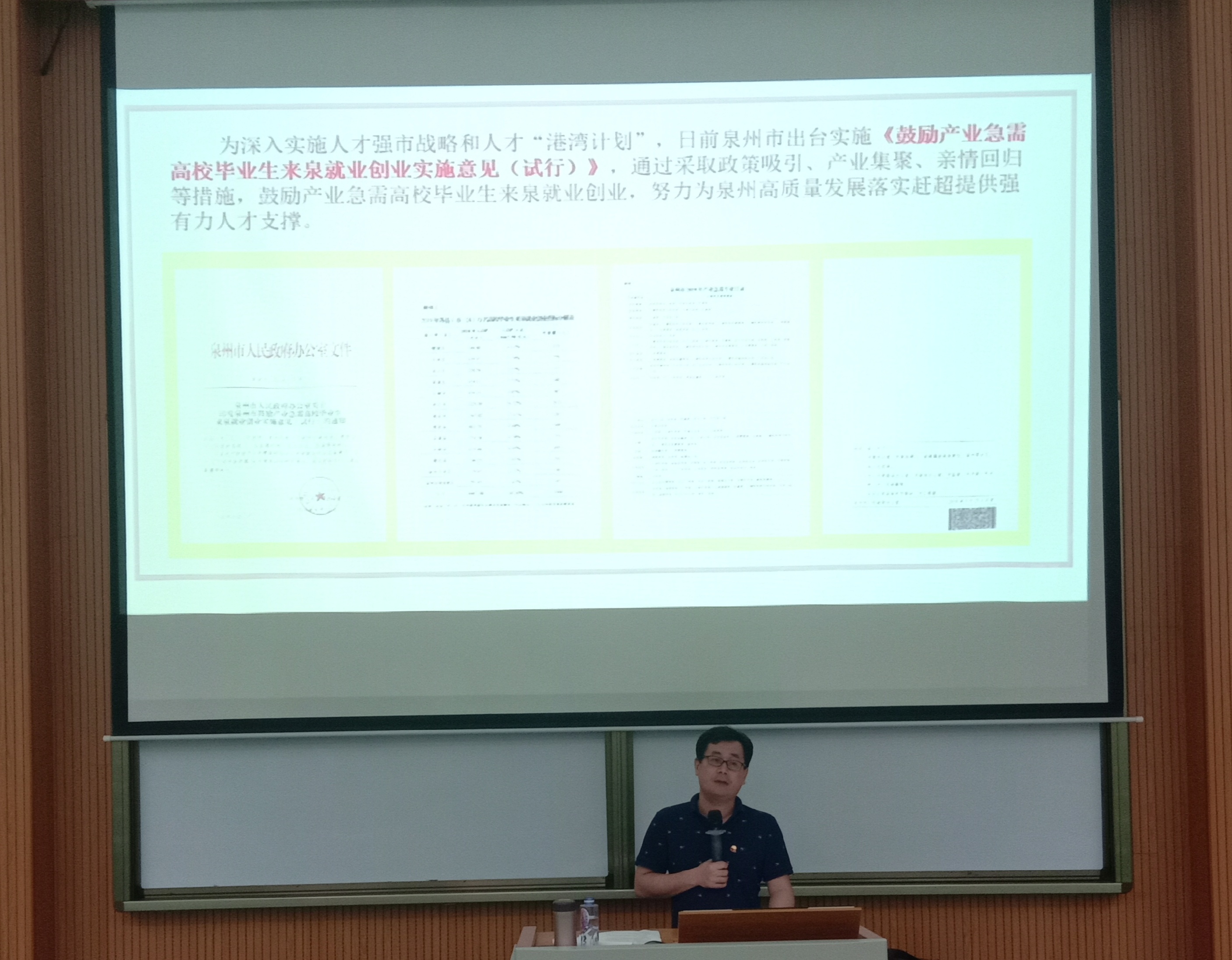 宣传活动现场    李瑞松引用马克思的话“一个时代的性格,是青年代表的性格;一个时代的精神,是青年代表的精神”作为开篇,从“青春建功新时代——新青年需团结,热爱祖国建功当代”和“筑梦泉州新作为——新作为需奋斗,才聚港湾筑梦泉州”两个方面进行宣讲。他强调新时代中国青年要有新思想、新使命、新本领,热爱祖国建功当代,并向在场的团员青年介绍了泉州的经济发展状况、人才扶持政策、就业创业政策,鼓励大家将来留泉就业和创业,奋斗实现才聚港湾筑梦泉州的理想。