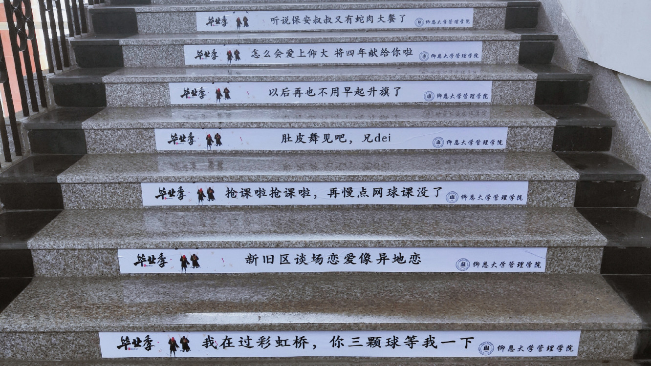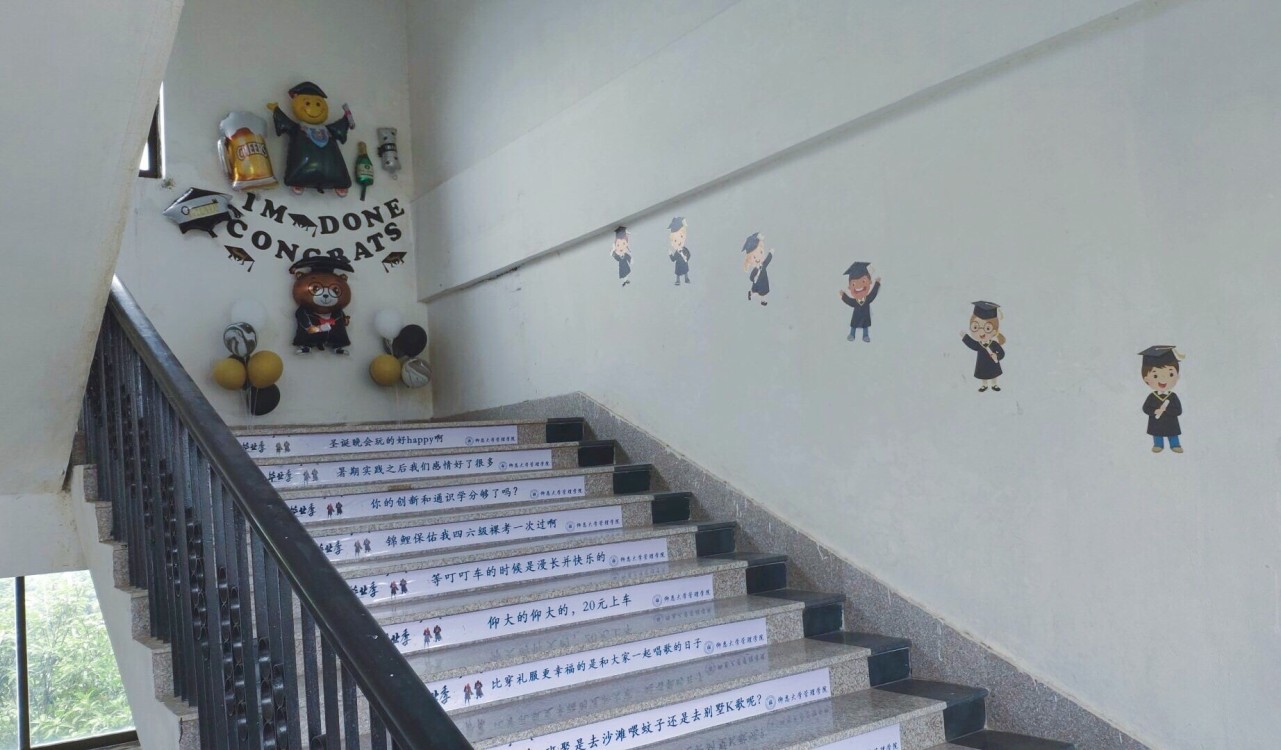 留言墙    回忆走廊展示的内容多样,形式丰富,在每级台阶都张贴了毕业季语录,这些语录都是“那些年”经常与好友挂在嘴边的经典话语。此外,回忆走廊墙上设置了留言板块,毕业生们可留关于仰恩的回忆。场地布置十分精美,引得师生驻足拍照。