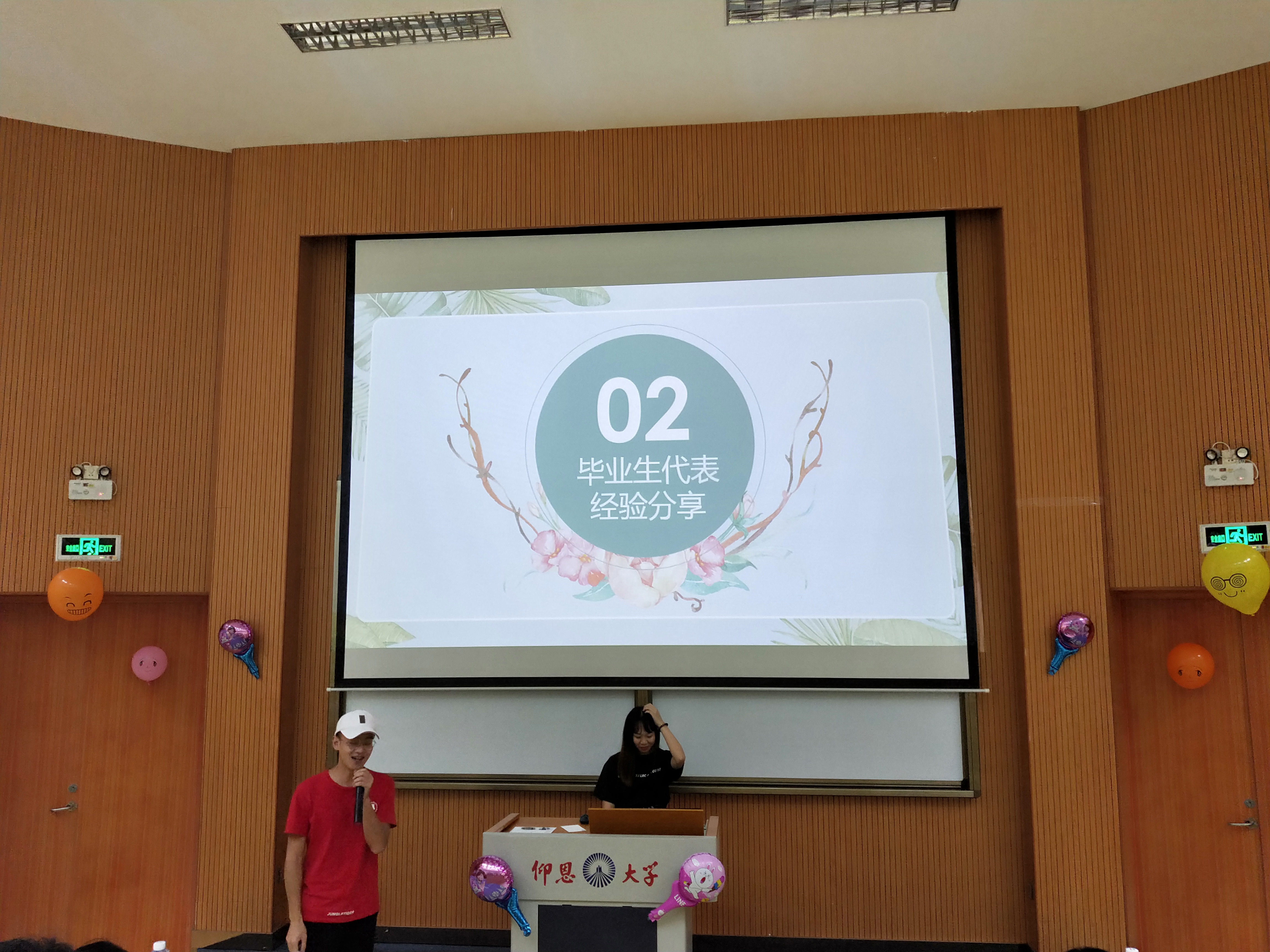 欢送会现场    本次欢送会主要由歌舞表演、毕业班学子经验分享、老师祝福三个环节展开。欢送会一开场就以劲爆的舞蹈表演赚足了看点,吸引了观众的眼球。同时在毕业班学子经验分享环节中,学长学姐从不同的方面讲述了对仰恩、对市销的感情。许明杰学长和吴雄伟学长为同学们介绍了他们实习工作的经历,给在场同学职业规划提出了宝贵的意见。张宇翔、谢开扬学长及马雪婷学姐则讲述了仰恩四年的美好时光,鼓励学弟妹们要勇敢追梦。最后,市场营销系主任李瑞松老师对毕业班学子寄予最诚挚的祝福,同时也希望所有同学都能在大学四年里发展自己,成为下一批优秀的学长学姐。