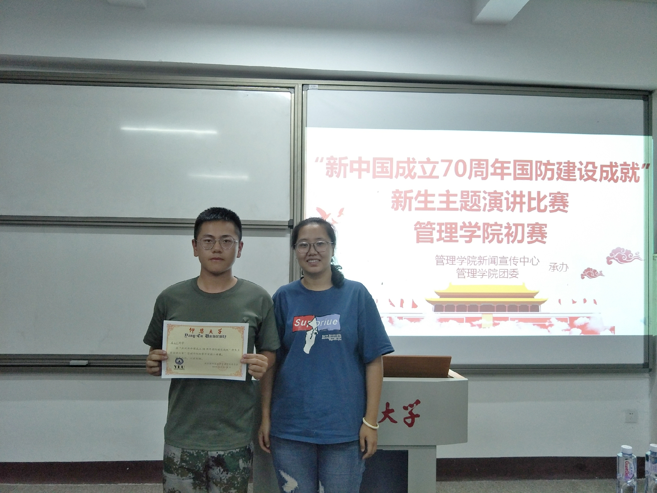 比赛现场 比赛现场,2019级新生参赛选手各个激情澎湃,从不同的视野和角度,用饱含深情的语言述说着对祖国母亲的热爱,以及对国防建设成就的自豪之情。最终,经过激烈角逐,2019级工商管理2班何梦丹获得一等奖,2019级工业工程1班林紫芯、2019级工商管理2班黄如达获得二等奖,2019级市场营销专升本王俏俏、2019级物流管理专升本肖媛、2019级物流管理1班郭海伦获得三等奖。