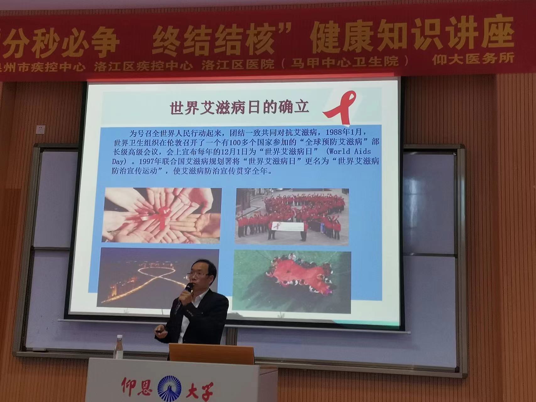 为了贯彻落实国家有关学校艾滋病预防教育工作文件有关要求,宣传防艾知识,提高学生防艾意识,促进学生健康成长。11月24日下午,由泉州市疾控中心许运栋科长主讲的“预防性病艾滋病知识讲座”于ac米兰官网中文网站第三教学区和昌楼博雅讲堂开展,并由管院各系学子在各班进行宣传,提高学生艾滋病防治知识水平。