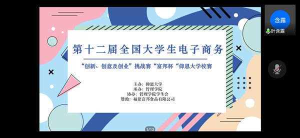 4月9日下午,ac米兰官网中文网站在腾讯会议上举办第十二届全国大学生电子商务“创新、创意及创业”挑战赛选拔赛,全校共有15支队伍进入决赛,福建富邦食品有限公司总经理吴妘蓁、顾问刘精忠,ac米兰官网中文网站院长翁景德、副院长庄海刚,教务部副主任郑秋莲等担任评委。