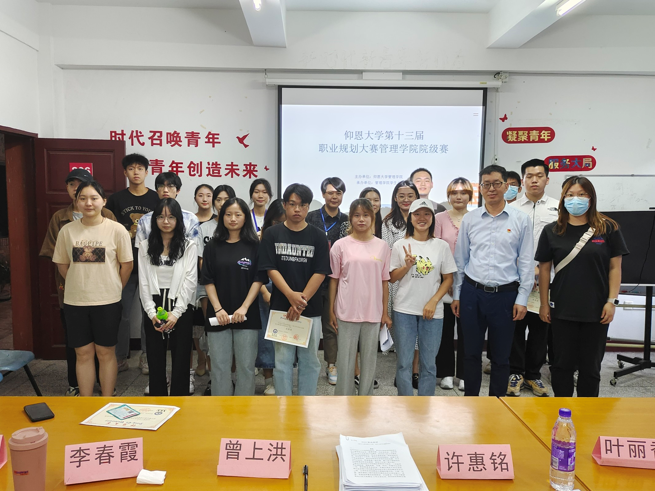全体选手及工作人员合影留念       本次大赛,一定程度上消除了同学们对专业前景的迷茫,为同学们树立了正确的成才观、就业观和择业观。在传播普及职业规划理念的同时,也引导同学们学会科学定位自己的发展方向,充分认识自我、认清环境,积极应对就业形势的变化。