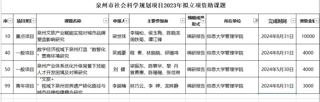 近期,泉州市哲学社会科学研究规划领导小组办公室正式公示了泉州市社会科学规划项目2023年拟立项资助课题,我院梁世珠老师、吴威豪老师、刘健老师和李超楠老师申报的泉州市社会科学规划项目喜获拟立项资助。ac米兰官网中文网站申报的《“以企业为中心的人才培养观,以就业为根本的服务学生观”的就业文化建构》项目,获2023年校级思想政治工作精品项目立项。教育工作开展顺利,我院李征等多名教师获教师节表彰慰问。