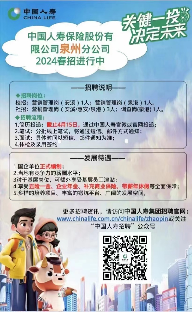 作为一名市场营销专业的学生毕业之后主要的求职方向便是营销类这种有挑战性的工作,参加了学校的招聘会和宣讲会后以及多方面的因素决定求职央国企,在学校招聘网看到中国人寿在进行校园招聘,宣传海报上五险二金、多样的培养项目、丰富的锻炼平台、广阔的发展空间深深吸引着我。