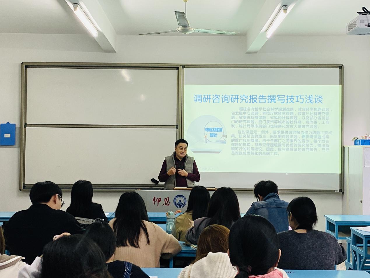 雷宏教授以“调研咨询研究报告撰写技巧浅谈”为主题,开始了他的分享。他首先强调了调研报告在科研工作中的重要性,随后详细讲解了撰写报告时应遵循的原则、方法和技巧。雷教授结合自己多年的研究经验,通过生动的案例和实用的建议,让在场的教师们受益匪浅。他提醒大家,在撰写报告要深入调研,注重数据的准确性和分析方法的科学性,同时也要注意报告的逻辑性和可读性,确保研究成果能够清晰地传达给读者。