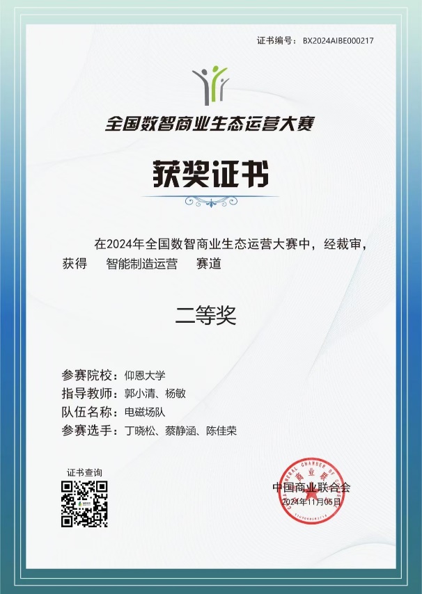 我院共4支队伍报名参加智能制造赛道,本次比赛历经近一个月的练习赛,每场练习赛4支队伍都认真准备。练习赛前,他们积极制定计划、联系合作伙伴,练习赛后,他们认真复盘、总结。通过初赛的激烈竞争,4支队伍最终获得二等奖、三等奖的佳绩。其中,由2021级工业工程专业的丁晓松、陈佳荣和2022级物流管理专业的蔡静涵同学组成的“电磁场队”荣获国家级初赛二等奖;由2022级工业工程专业的吕宁萍和2022级物流管理专业的张雪莹、施盈珊同学组成的“智能小纵队”荣获国家级初赛二等奖; 由2021级工业工程专业的施荣炮、姚建军和2023级工业工程专业的王博同学组成的“CrazyHeart队”荣获国家级初赛三等奖; 由2022级工业工程专业的张慧娜、吕莉欣和胡捷敏同学组成的“钱途无量队”荣获国家级初赛三等奖。