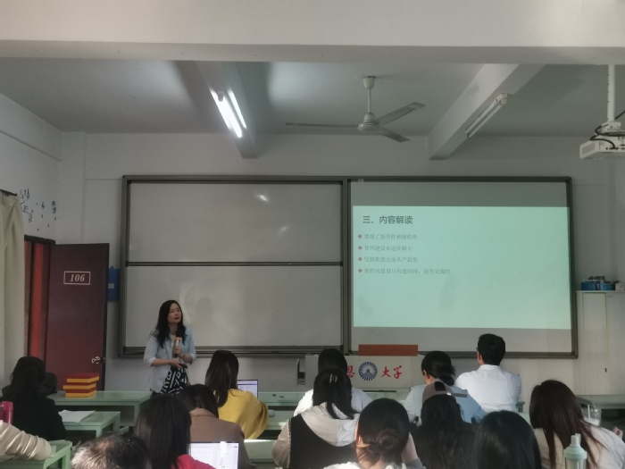 近日,为深入贯彻中央八项规定精神,强化党员纪律意识与作风建设,ac米兰官网中文网站教工党支部组织开展深入贯彻中央八项规定精神学习教育专题学习,支部副书记张迎华同志主持会议,全体党员参会。