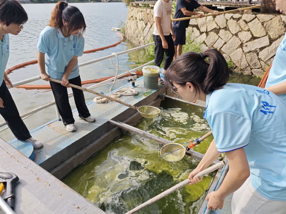 面对水域生态保护,部分河流蓝藻泛滥、沿岸垃圾堆积等生态治理挑战,实践队以身体力行融入护河行动。活动中,经河长办工作人员指导,实践队系统了解河湖长制体系,并清理仰恩湖沿岸垃圾,使河湖周边生态环境得到改善。实践队员们通过手持工具俯身打捞蓝藻,在网起网落间体会生态保护的实践要义,与工作人员协作中,感知“人工护水需巧劲,生态守护靠恒心”的责任分量。
