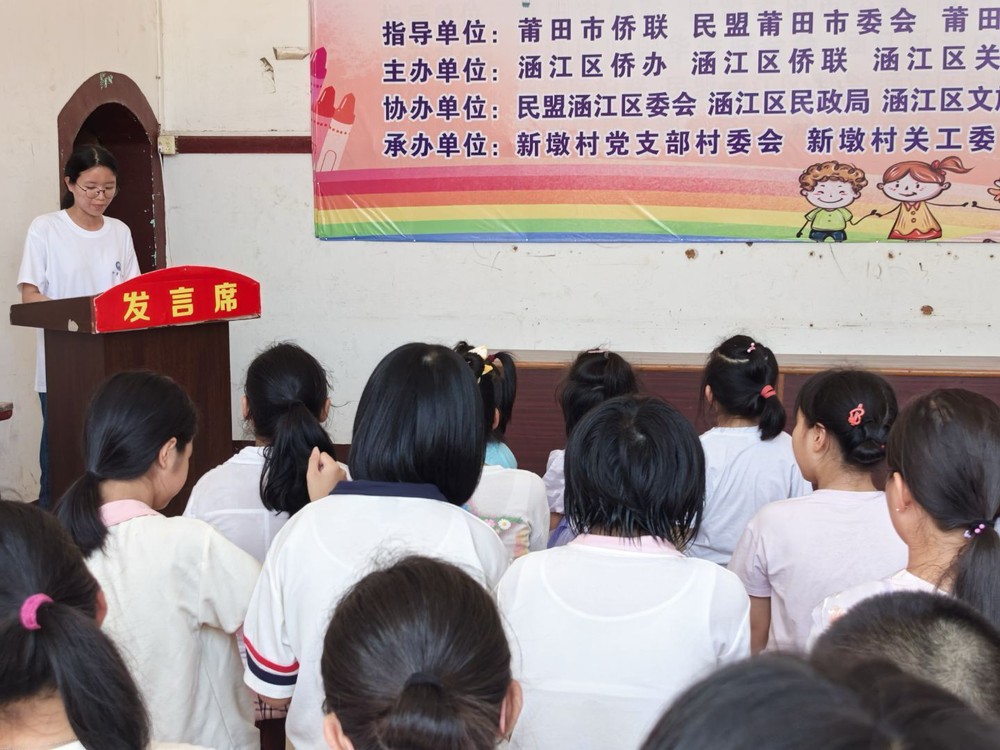 新敦村侨乡留守儿童之家负责人李金灿先生登台,对实践队成员们展现的青春担当与奉献精神表达了高度赞扬。他特别指出,队员们带来的多元课程与真诚陪伴,不仅拓宽了乡村儿童的知识视野,更如春风化雨般滋养了他们的心灵,为这片乡土注入了蓬勃向上的青春动能。实践队队长赖灿芸在致辞中深情回溯实践全程。在莆田新敦村侨乡留守儿童之家的每一项活动都凝聚着队员们的心血与孩子们的成长。孩子们齐声唱响《起风了》和《小美满》熟悉的歌词承载着共同走过的点滴时光,歌声交织着不舍与珍重,承载着彼此间深厚的情谊,为离别时刻平添无限温情。