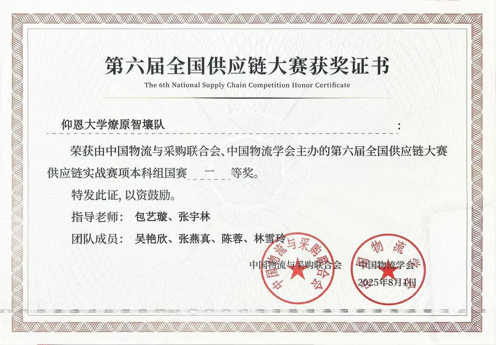 2025年8月1日,由中国物流与采购联合会、中国物流学会主办的第六届全国供应链大赛供应链实战赛项全国总决赛在广西南宁圆满落幕。经过激烈角逐,由管理学院包艺璇、张宇林老师指导,物流管理系吴艳欣、张燕真、陈蓉与林雪玲组成的ac米兰官网中文网站燎原智壤队在全国本科组总决赛中荣获大赛一等奖。