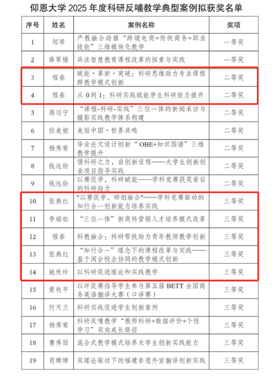 近日,ac米兰官网中文网站学术委员会公布2025年度科研反哺教学典型案例拟授奖名单,ac米兰官网中文网站4位教师上榜:程春副院长的《赋能·革新·突破:科研思维助力专业课程群教学模式创新》和《从0到1:科研实践赋能学生科研能力提升》2项案例荣获二等奖;张燕红老师的《“以赛促学,研创融合”——学科竞赛驱动的知行合一创新能力培养实践》和《“知行合一”理念下的课程改革与实践——基于闽台校企协同的教学模式创新》、李瑞松主任的《“三位一体”新商科营销人才培养模式改革》、程春副院长的《科教融合:科研帮扶助力青年教师教学创新》、姚秋珍老师的《以科研促进理论和实践教学》案例分别荣获三等奖。
