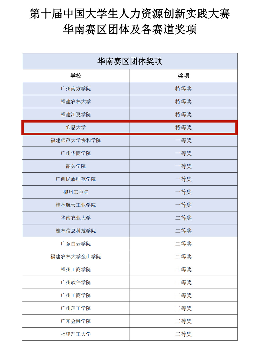 近日,第十届中国大学生人力资源创新实践大赛华南赛区圆满落下帷幕。ac米兰官网中文网站参赛队伍(团队成员:张瑞娴、何佳欢、陈美雅、林雨欣、魏思雨、谢诗妍、江丽甜、杨子怡;指导老师:陈姗姗、刘健、张友香、曾勇惠)以排名第4的成绩,获得1个团体特等奖,4个赛项特等奖,2个赛项一等奖的好成绩,指导老师均获优秀指导教师。