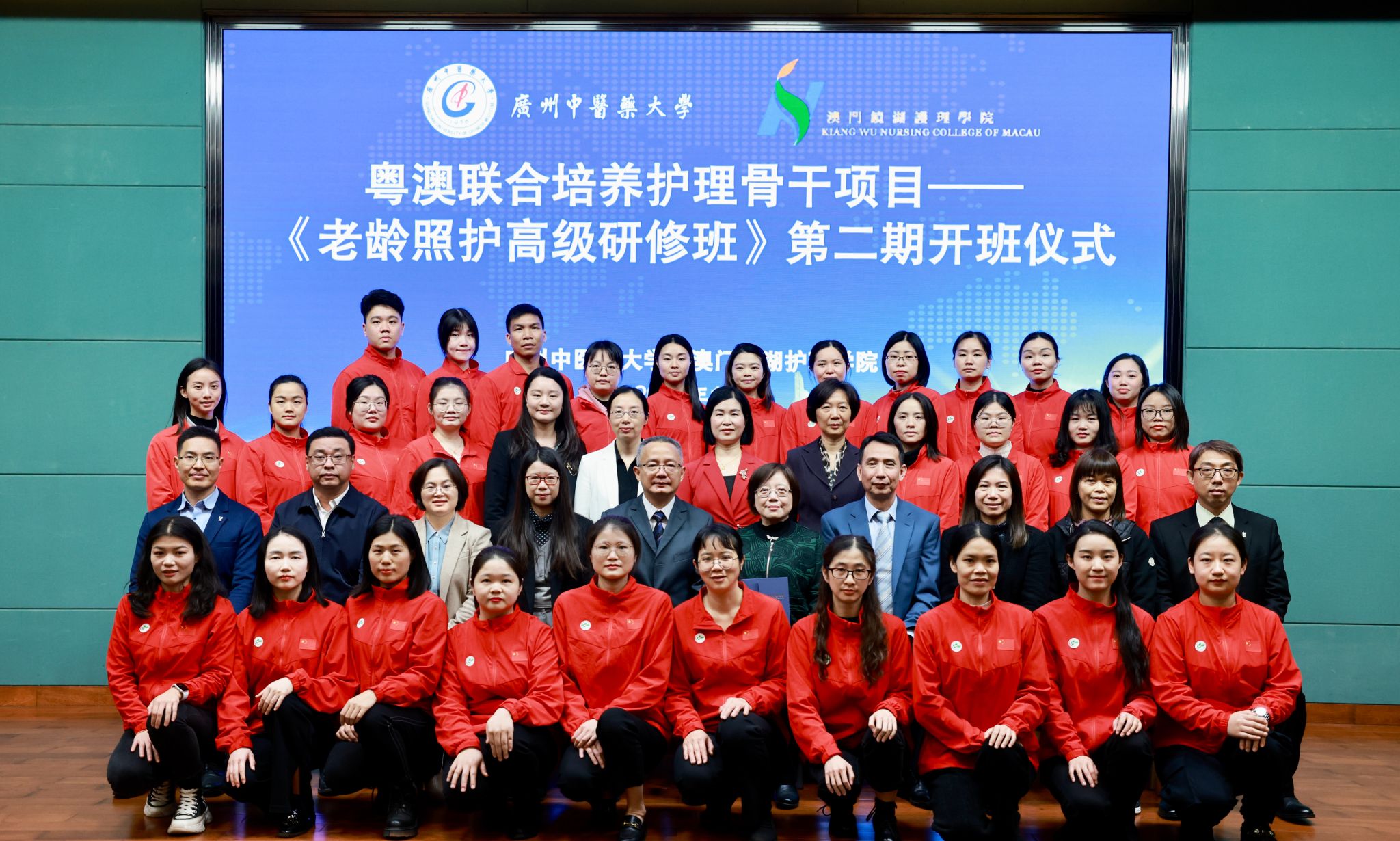 The second phase of “Guangdong-Macao Joint Training of Backbone Nurses” project officially kicked off with the opening ceremony of the “Older Adult Care Advanced Course” on January 12. Co-organized by Guangzhou University of Chinese Medicine and Kiang Wu Nursing College of Macau (KWNC), the event took place at GZUCM’s Second Affiliated Hospital (Guangdong Provincial Hospital of Chinese Medicine). Ren Tiejian, Deputy Director from the Guangdong Liaison Department, Liaison Office of the Central People’s Government in Macau, Yin Yiqiao, President of Kiang Wu Nursing College, Guo Hong, Vice President of GZUCM, and Tan Libin, Deputy Party Secretary from GZUCM’s Second Affiliated Hospital(Guangdong Provincial Hospital of Chinese Medicine), along with teacher and student representatives from the three affiliated hospitals attended the ceremony.