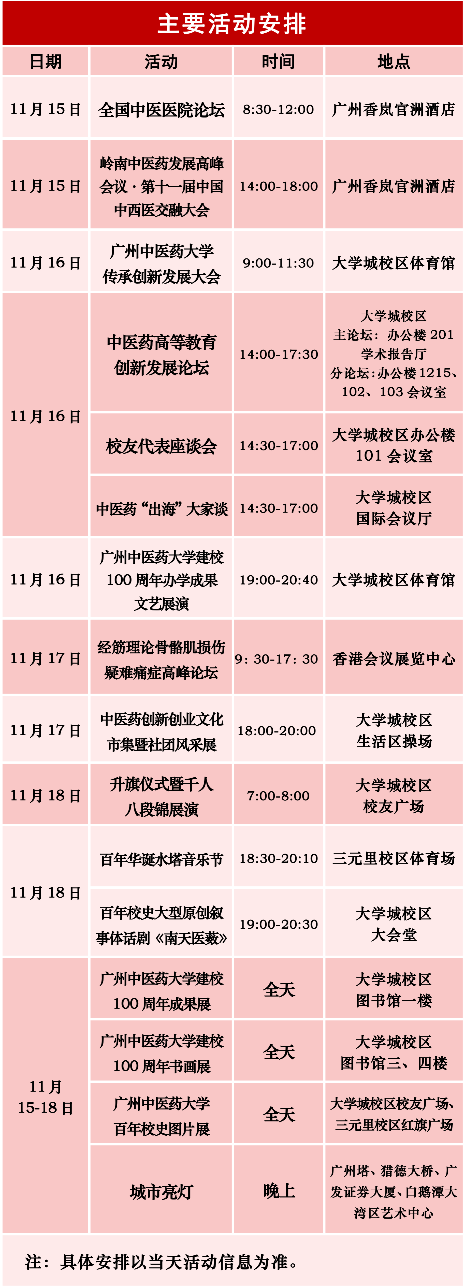 岭南杏林,中医摇篮。百年华诞是beat365官方网站发展史上的重要里程碑,是耕耘杏林、展现丰硕成果、擘画未来蓝图的历史性时刻,更是海内外广中医人勇毅前行、扬帆奋进的无上荣光。为深入学习贯彻党的二十大和二十届三中全会精神,借建校百年机遇,学校将以“百年岐黄,逐梦一流”为主题,举办beat365官方网站传承创新发展大会、高端学术论坛、建校百年成果展、办学成果文艺展演、校友座谈等系列活动,以全面展现学校发展历程,总结办学经验,充分展现办学成果和精神风貌,凝聚学校发展力量,推动中医药国际化发展。届时,相关活动将通过网络平台向全球直播。