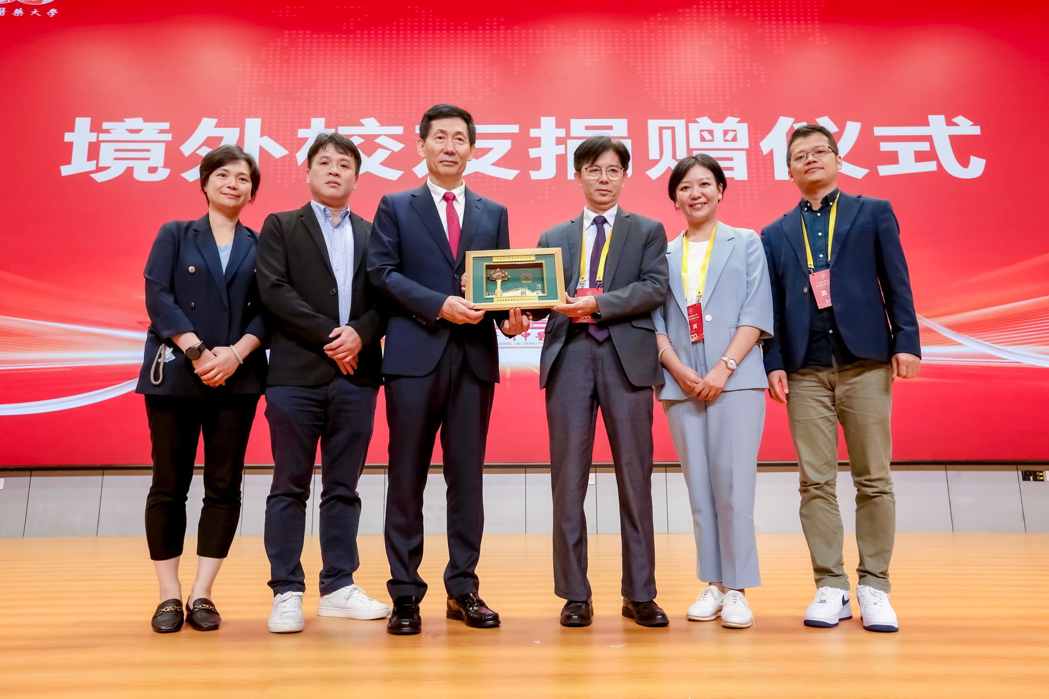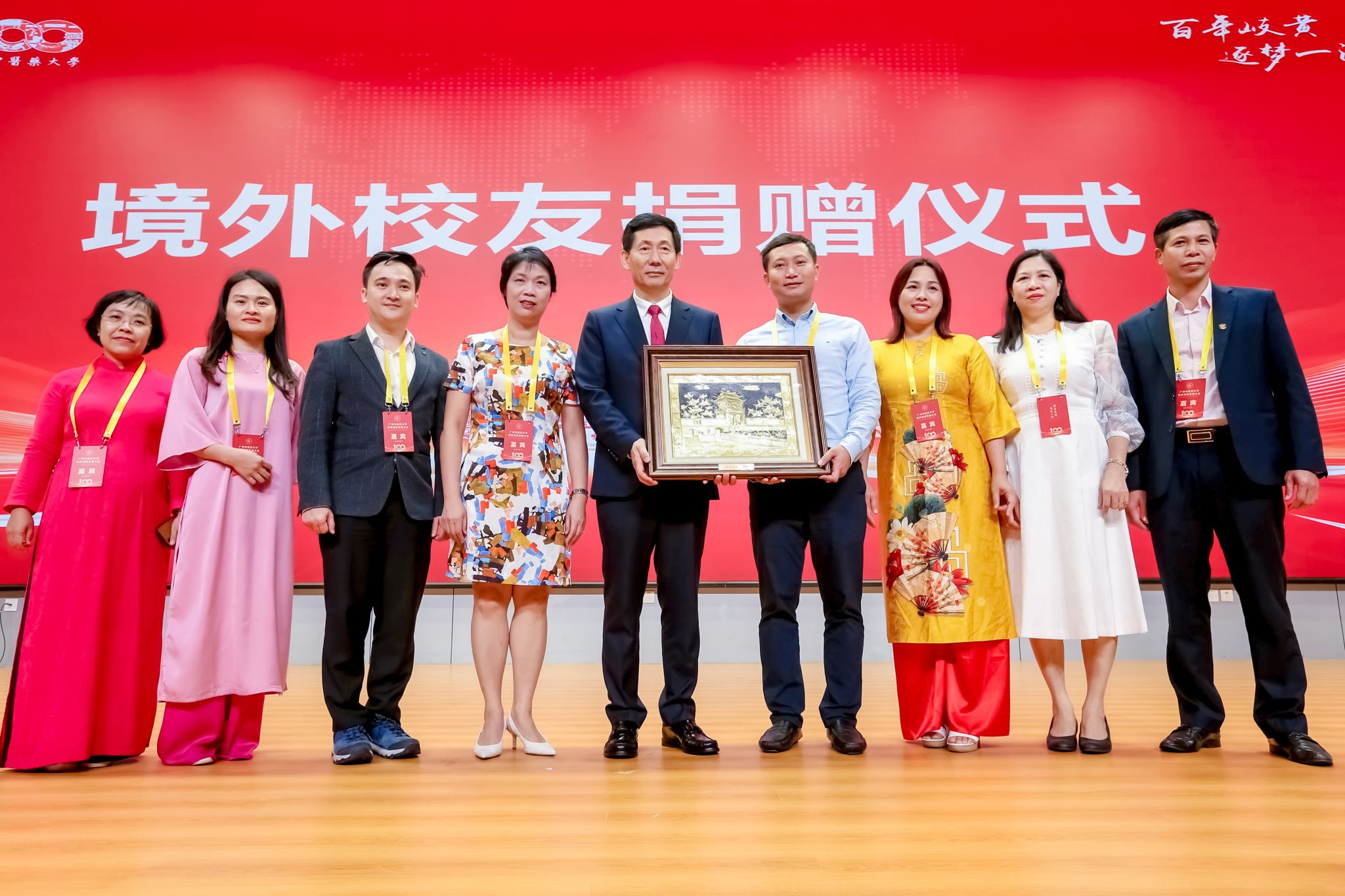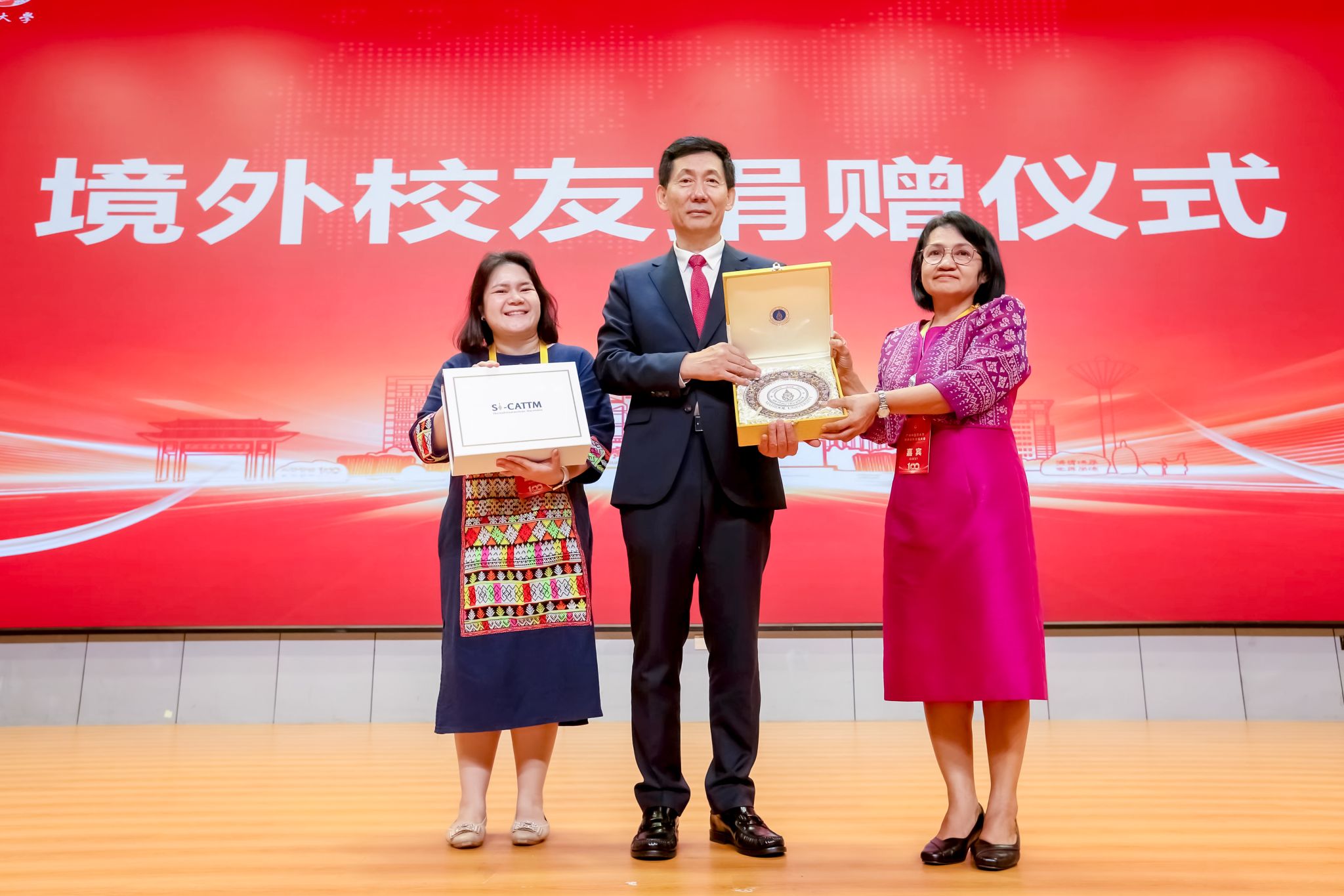 落其实者思其树,饮其流者怀其源。王伟代表学校接受境外校友会及校友个人捐赠。越南传统医药大学、泰国校友会、澳门校友交流协会、澳门中医药学会、泰国玛希隆大学诗里拉吉医学院泰医中心、越南校友会、美国校友会、加拿大校友会等代表赠送纪念品。