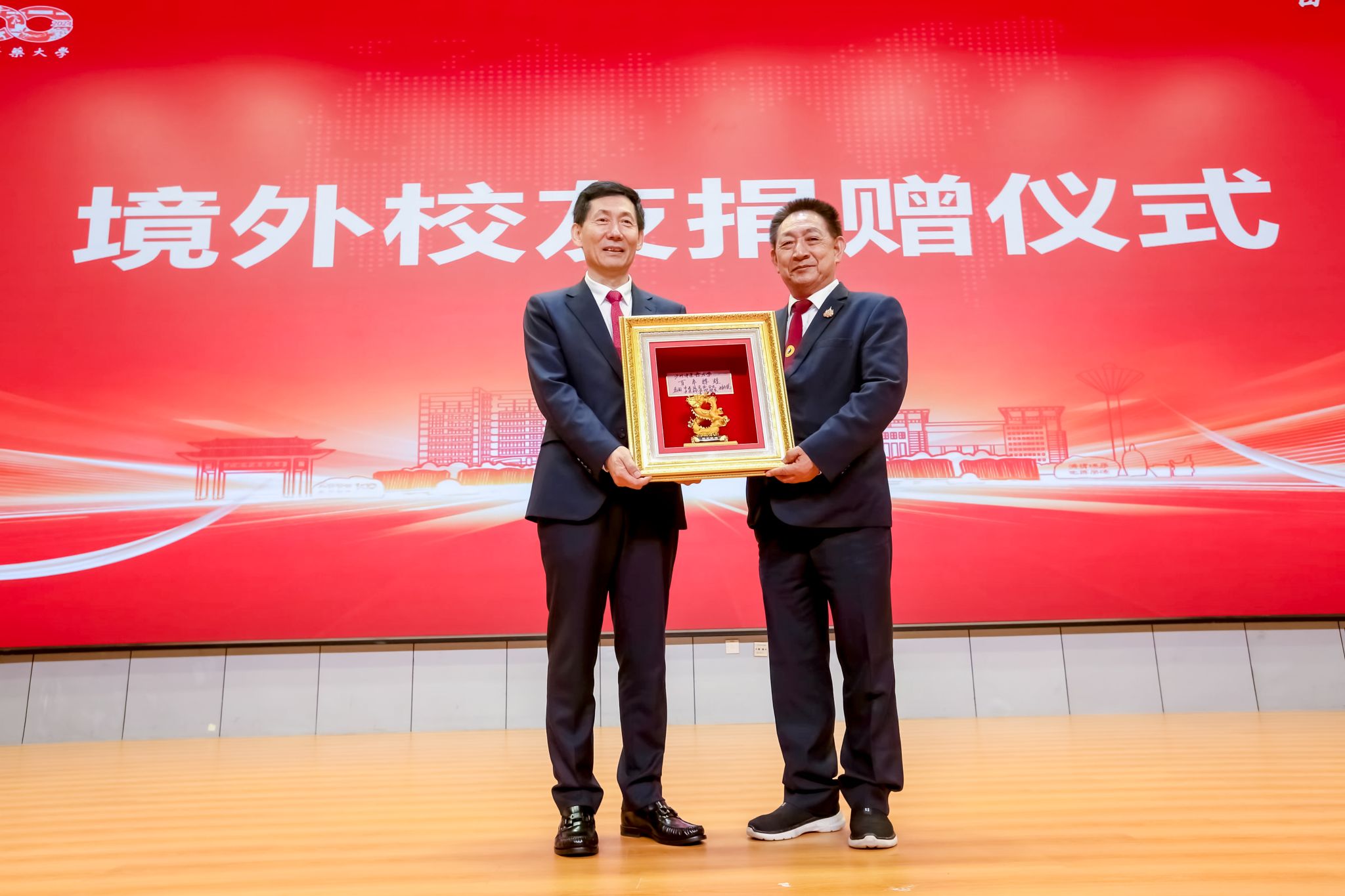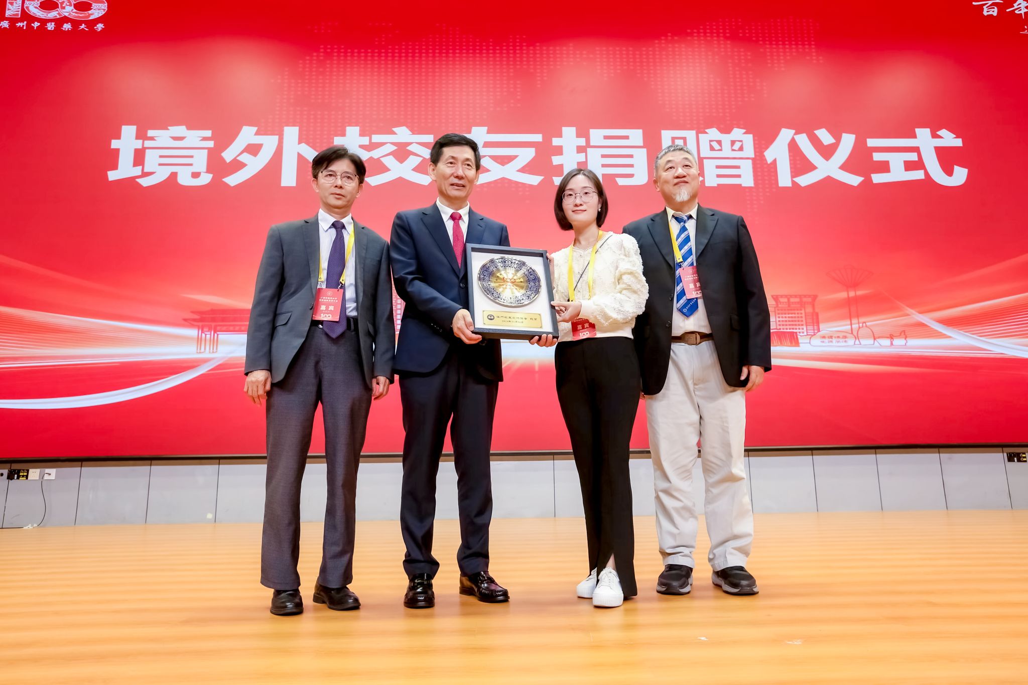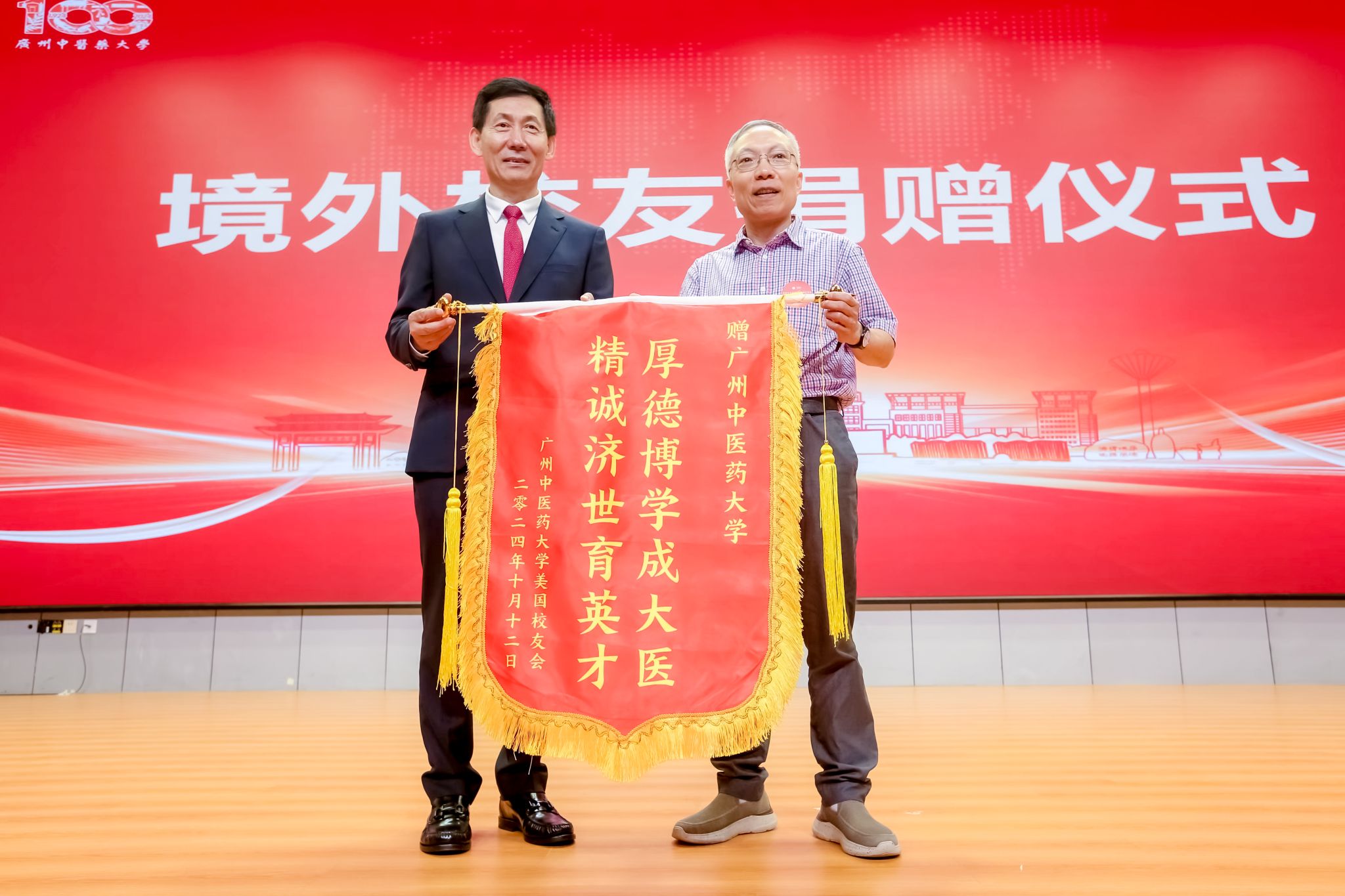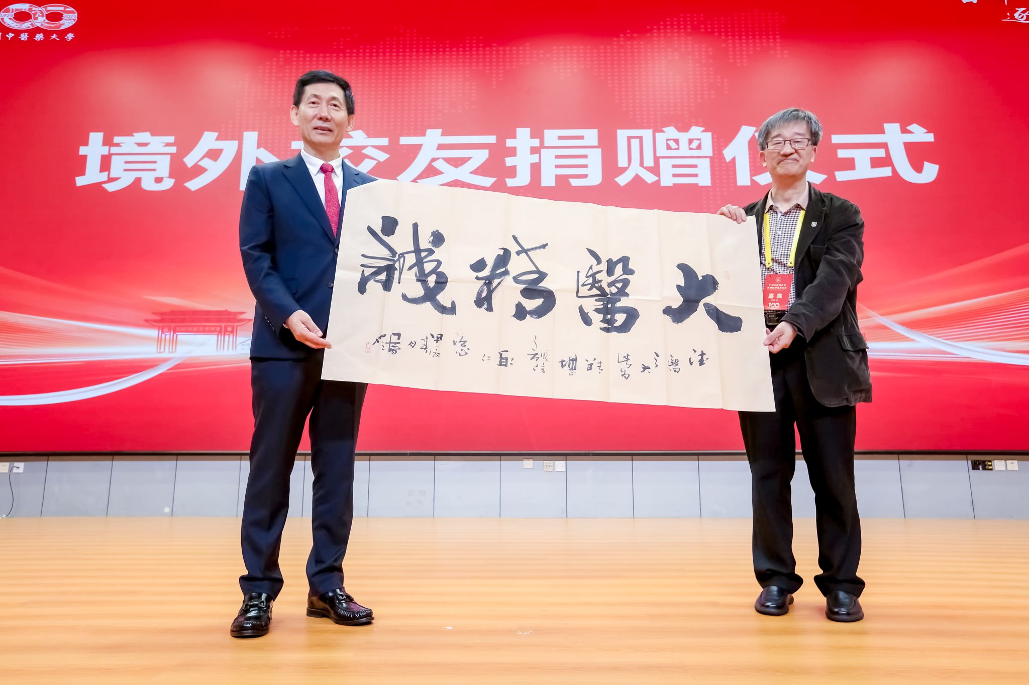 落其实者思其树,饮其流者怀其源。王伟代表学校接受境外校友会及校友个人捐赠。越南传统医药大学、泰国校友会、澳门校友交流协会、澳门中医药学会、泰国玛希隆大学诗里拉吉医学院泰医中心、越南校友会、美国校友会、加拿大校友会等代表赠送纪念品。