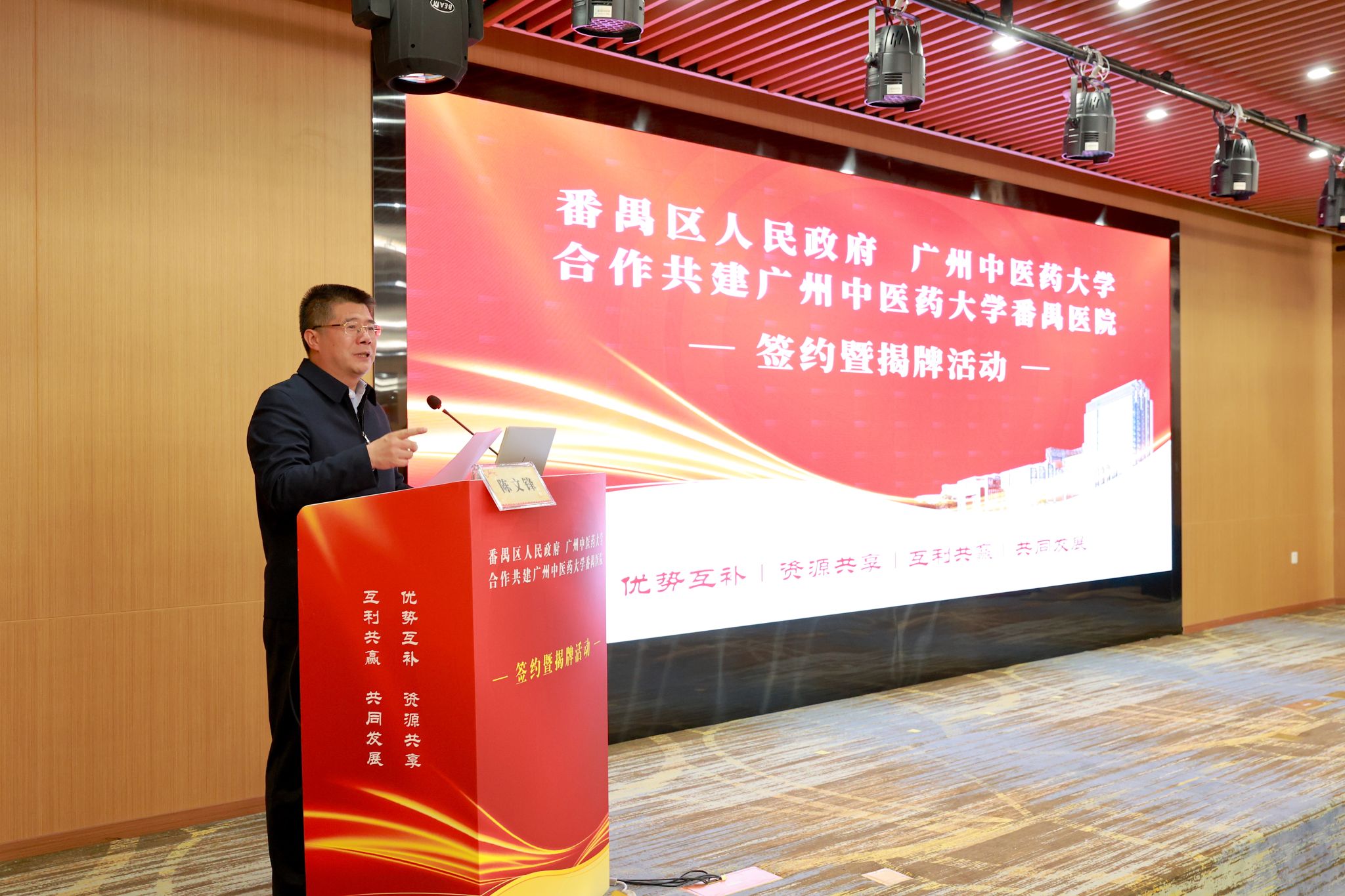 陈文锋在致辞中对番禺区人民政府、beat365官方网站合作共建beat365官方网站番禺医院表示热烈的祝贺和期待。他表示,要以“双一流”和高水平大学的建设来赋能beat365官方网站番禺医院的建设发展。树立“大广中医”理念,参照学校直属附属医院的要求和标准,为番禺医院党的建设、教学、科研、人才队伍建设、学科专科建设、学生培养管理等方面全面赋能提供“一揽子”政策支持和资源供给。支持包括beat365官方网站番禺医院在内的各校政共建医院走特色创新发展之路,助力助推番禺区中医院再上新台阶。
