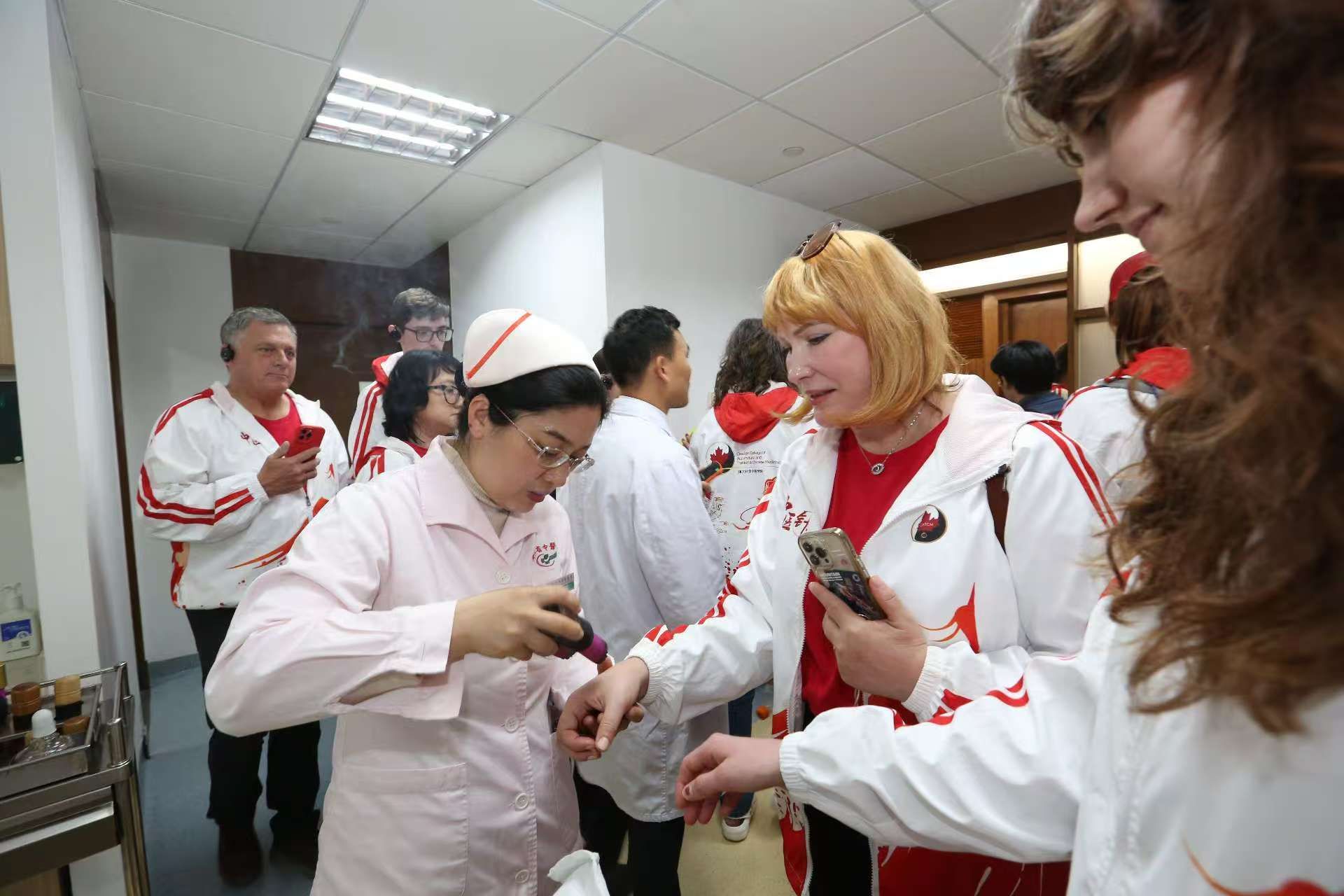 在beat365官方网站第二附属医院(广东省中医院)大学城院区,岭南甄氏杂病流派传承工作室的张曈老师用生动的案例向交流团讲述了中医在日常生活中的应用。交流团观看和体验了针灸、拔罐、艾灸、雷火灸、棍针等中医药传统疗法,对中医药在疾病预防、治疗和康复方面的优势有了更直观的体会。