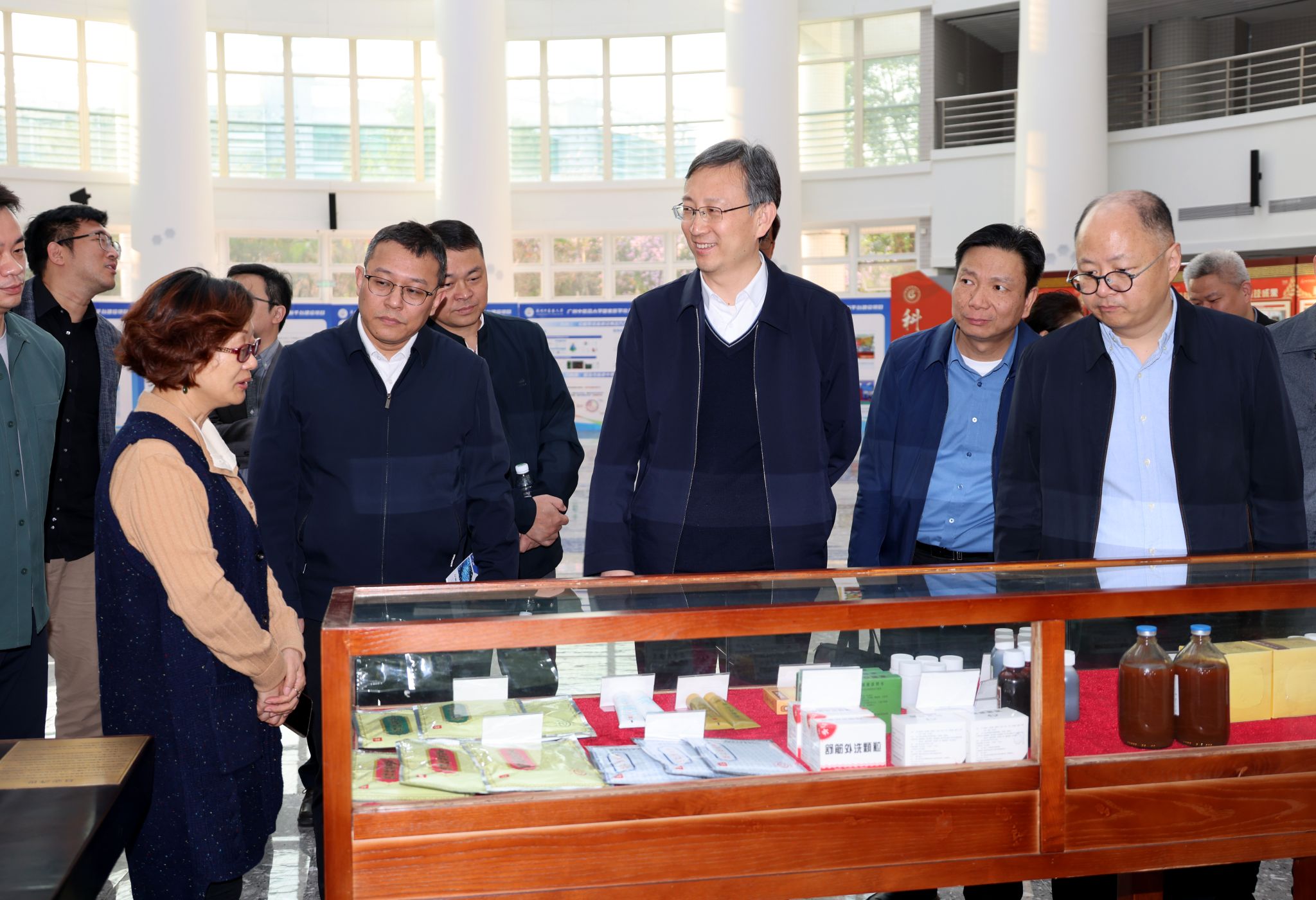 3月18日,国家药品监督管理局副局长杨胜率队赴我校国家医学攻关产教融合创新平台(以下简称“融创平台”)开展实地调研,深入了解中医药科研创新与产教融合成果。广东省药品监督管理局副局长王玲,校长王宏斌,党委常委、副校长杨荣源参加调研。