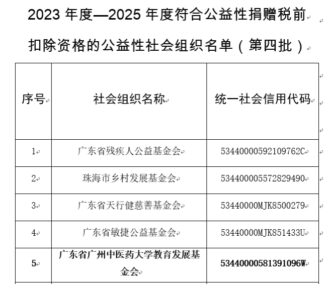 6月5日,广东省财政厅发布了《广东省财政厅 国家税务总局广东省税务局 广东省民政厅关于2023年度-2025年度(第四批)和2024年度-2026年度(第一批)公益性社会组织捐赠税前扣除资格名单的公告》(公告〔2025〕38号)。根据公告,广东省beat365官方网站教育发展基金会获得广东省公益性捐赠税前扣除资格(2023年度-2025年度)。