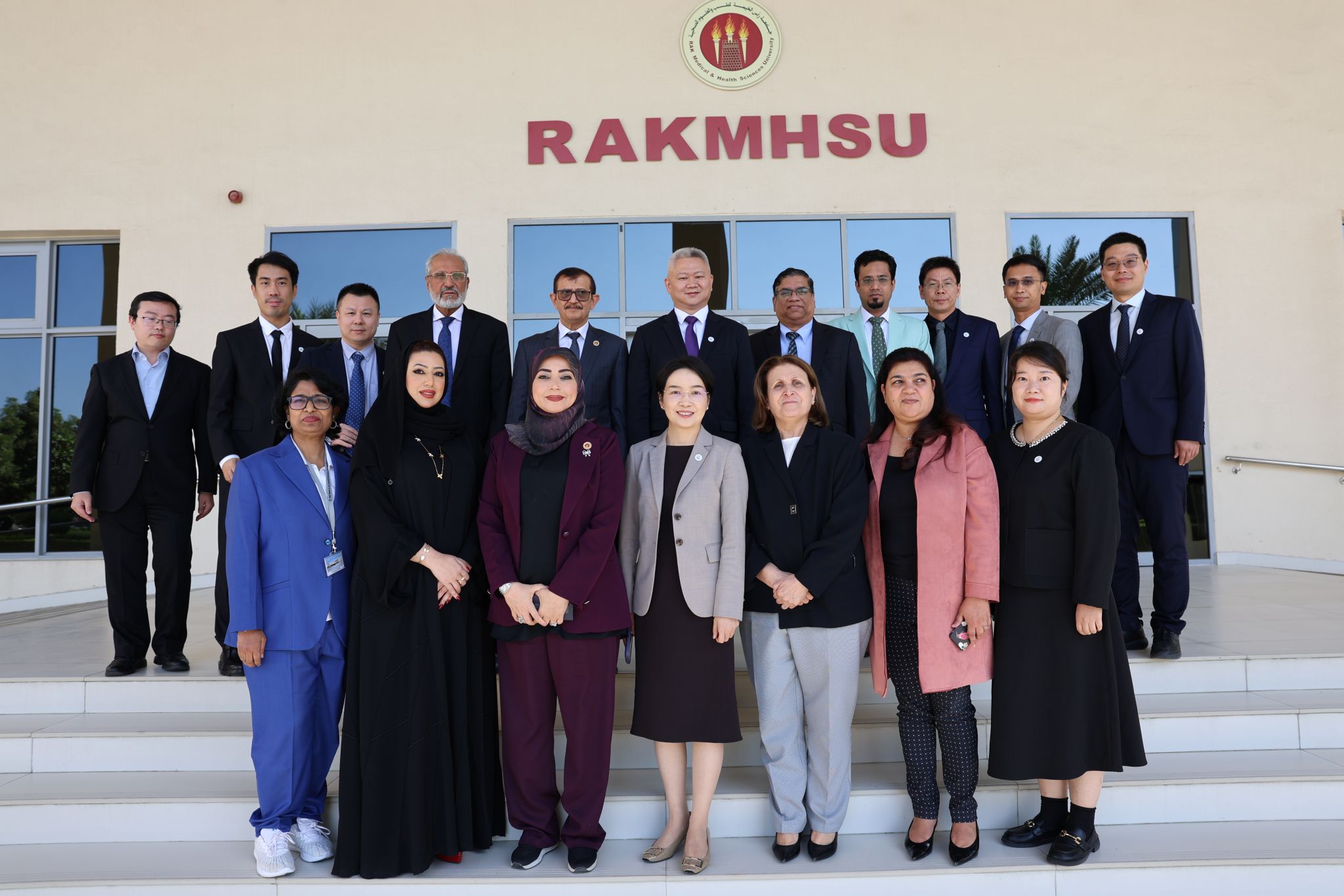 代表团走访哈伊马角医药与健康科技大学,参观教学科研设施并与副校长穆罕默德・伊勒 - 塔纳尼座谈,明确在护理学师生交流、联合科研攻关、中医药文化传播等方面的合作意向。随行专家现场开展中医针灸、推拿特色讲座,让当地师生直观感受中医药魅力。