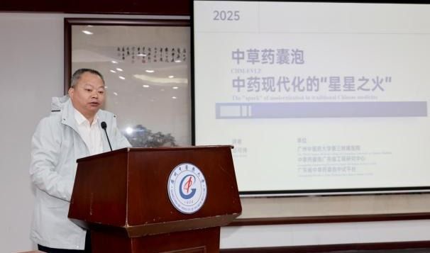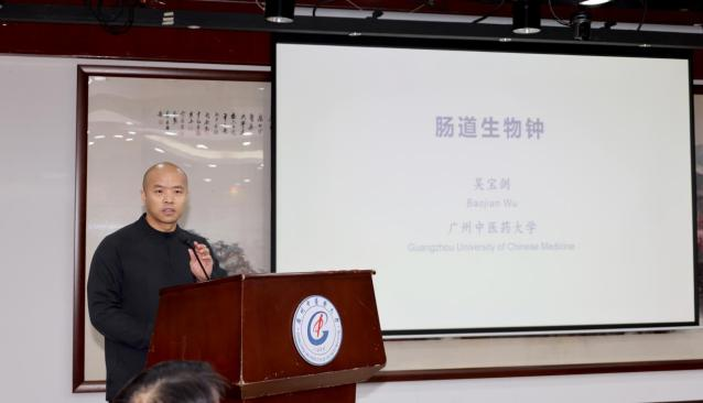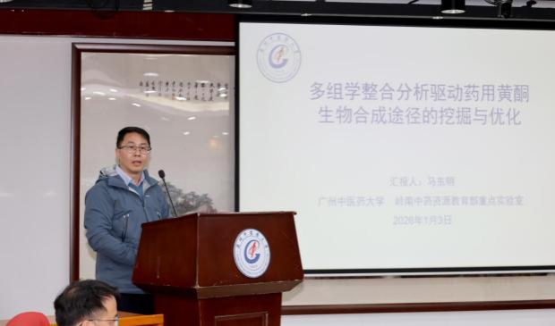 专题汇报环节由中药学院院长、实验室副主任白云龙主持。实验室学术骨干吴宝剑教授作《肠道生物钟》报告,詹若挺教授作《广东南药产业创新技术体系的构建与产业化实践》报告,赵可伟教授作《中草药囊泡,中药现代化的“星星之火”》报告,马东明研究员作《多组学整合分析驱动药用黄酮生物合成途径的挖掘与优化》报告。