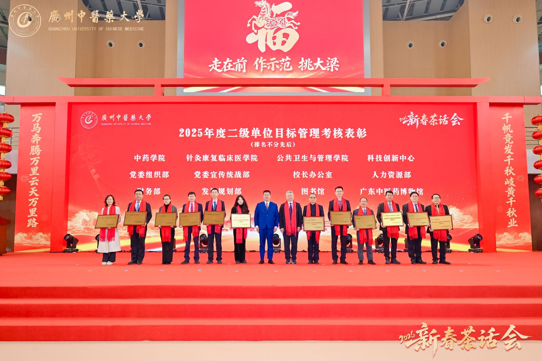本次新春茶话会同步举行表彰仪式,对2025年度校本部二级单位目标管理考核优秀单位、附属医院年度考核优秀单位,及其他领域获奖集体与个人予以表彰。