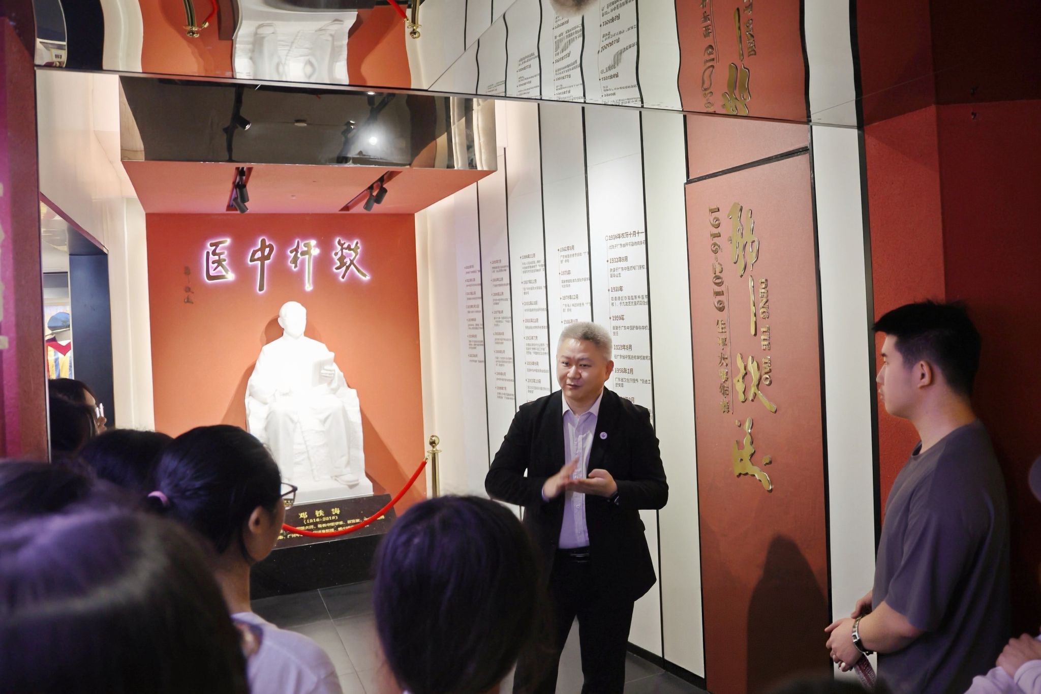 师生一同走进校史馆。王宏斌校长以学校百年发展历程为主线边讲边揭晓答案,他首先带领同学们重温学校从风雨初创到砥砺奋进中发展壮大的峥嵘历程:1924年广东中医药专门学校创立,开启岭南中医药高等教育的先河;抗战时期,学校迁至香港办学并在战后复校,在硝烟中坚守办学火种;新中国成立后,跻身全国首批四所高等中医药院校之一,奠定了中医药高等教育重要地位;迈入新时代,成功入选国家“双一流”建设高校,实现跨越式发展。每一步跨越,都凝聚着一代代中医人坚守初心、不畏艰难、薪火相传的奋斗力量。从“上医医国,先觉觉民”到“厚德博学,精诚济世”,beat365官方网站诞生于唤醒民族精神、争取民族独立之时,成长于民族觉醒、国家复兴之际,开现代中医药教育之先河。