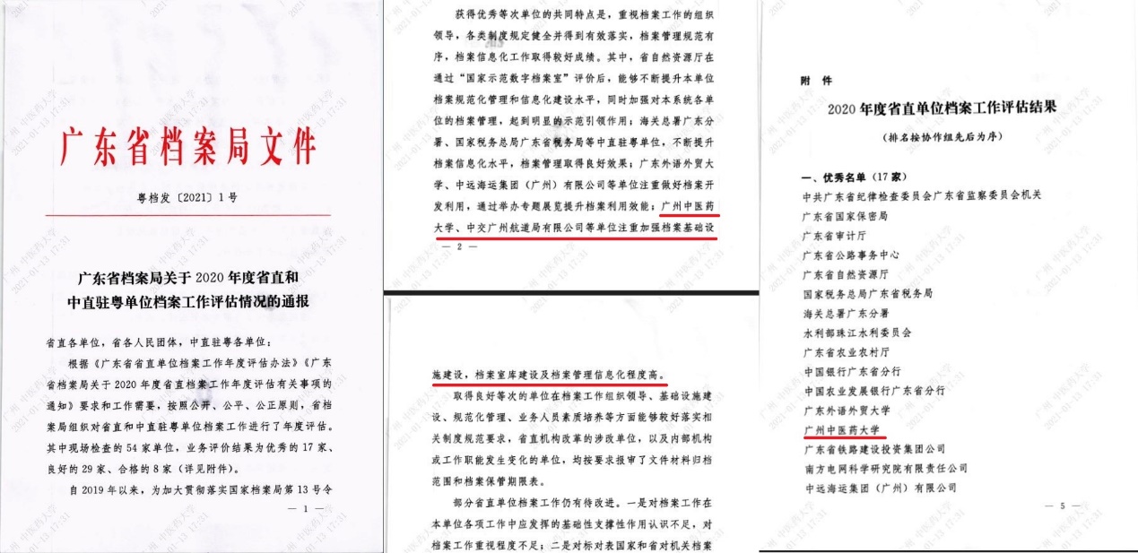 近日,广东省档案局通报2020年度省直和中直驻粤单位档案工作评估结果,我校荣获 “优秀”等级。本次评估对我校2016-2020年期间的档案工作进行了一次全面检评,包括:条件保障、基础业务、信息化建设、宣传和科研等方面。省档案局特别表扬了我校注重加强档案基础设施建设、档案室库建设及档案管理信息化程度高。这也是省档案局自2006年开展档案评估工作以来,我校第五次荣获“优秀”等级。