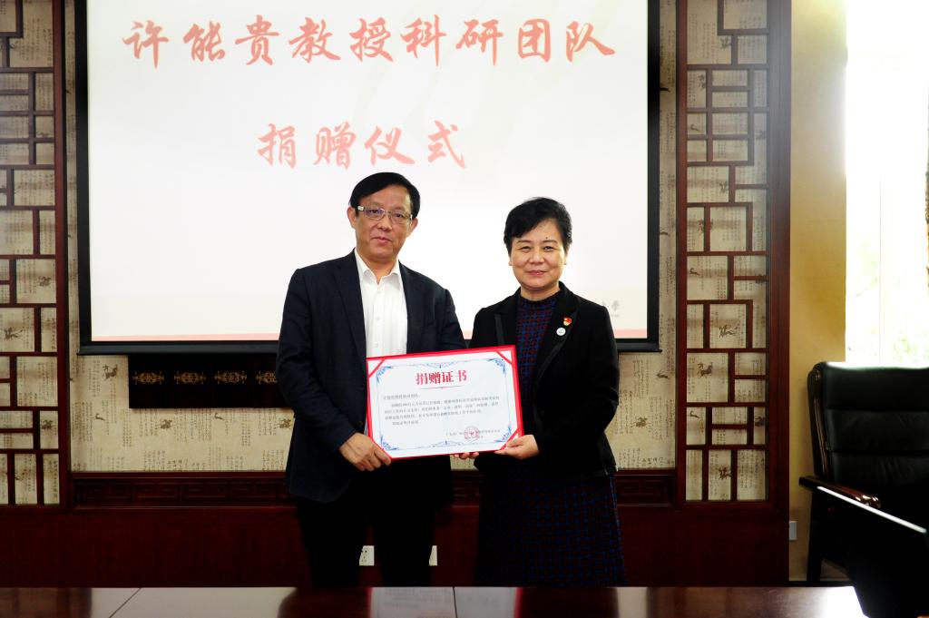 张建华向团队代表颁发了捐赠证书。她高度赞赏了许能贵教授科研团队回馈学校的善举和对学校事业的支持。她指出,当前,学校新型冠状病毒肺炎疫情的防控工作有序推进,全校教职员工要以实际行动积极投入到疫情防控工作中;要学习团队的科研精神,在成绩面前不骄傲、在失败面前不气馁,持之以恒,攻坚克难,为“双一流”和高水平大学建设共同努力。她希望团队继续努力,争取为中医药事业做出更大贡献。