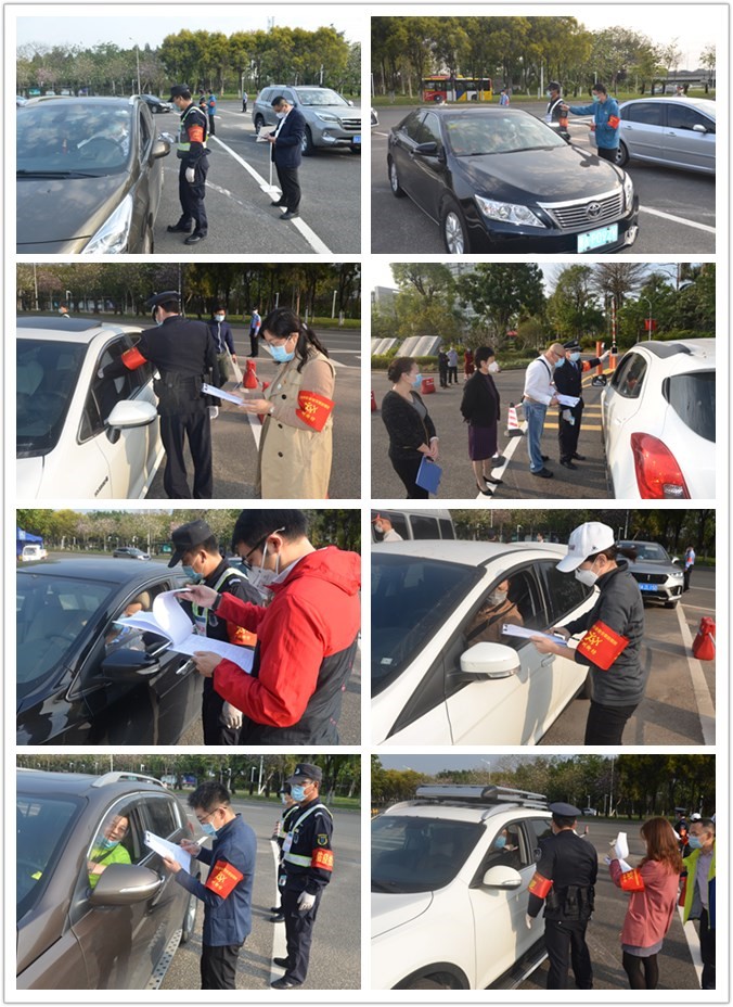 在学校正门广场,值岗党员干部协同保卫人员执勤,核查进校人员、车辆,进行登记验证、测温、检查车辆后尾厢,坚决把好校门第一关,严防疫情输入校园。当天,大学城、三元里两校区共有420名返岗教职工通过查验有序入校,现场秩序井然。