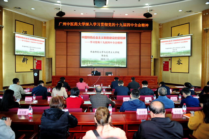 根据省委工作部署,12月2日下午,学校党委在办公楼201学术报告厅开展党的十九届四中全会精神宣讲学习活动,邀请广东省委宣讲团成员、华南师范大学陈金龙教授作辅导报告。副校长潘华峰主持宣讲会。