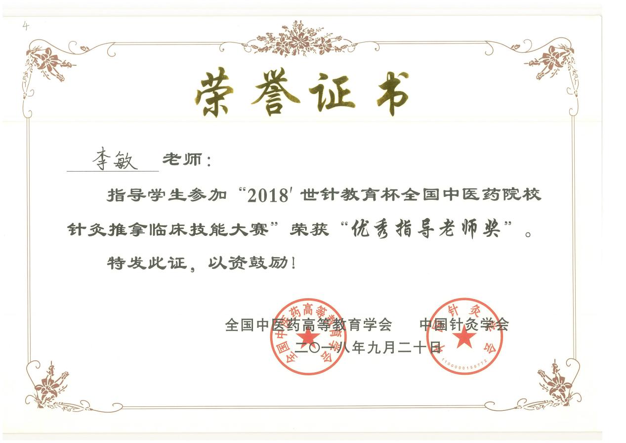 2018世针教育杯全国中医药院校针灸推拿临床技能大赛“优秀指导老师奖”
