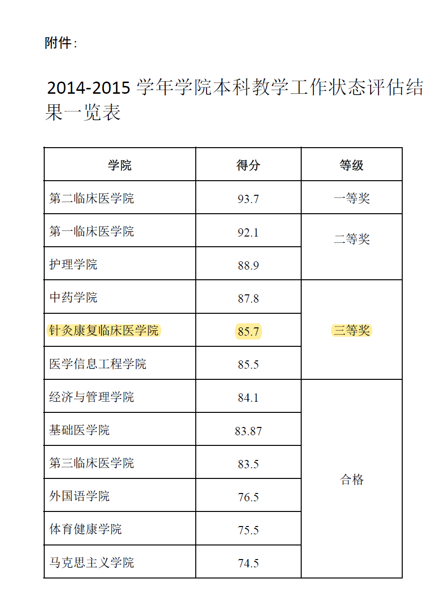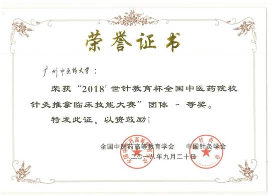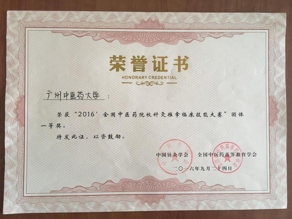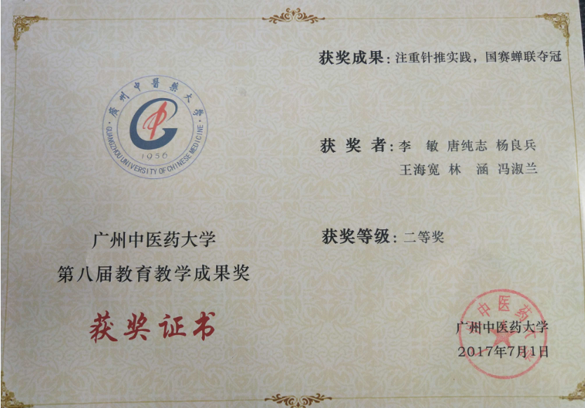 2014年、2016年、2018年三次组队带队参加全国中医药院校针灸推拿临床技能大赛均荣获“团体一等奖”(第一名)三连冠并三次获得“优秀组织”奖。