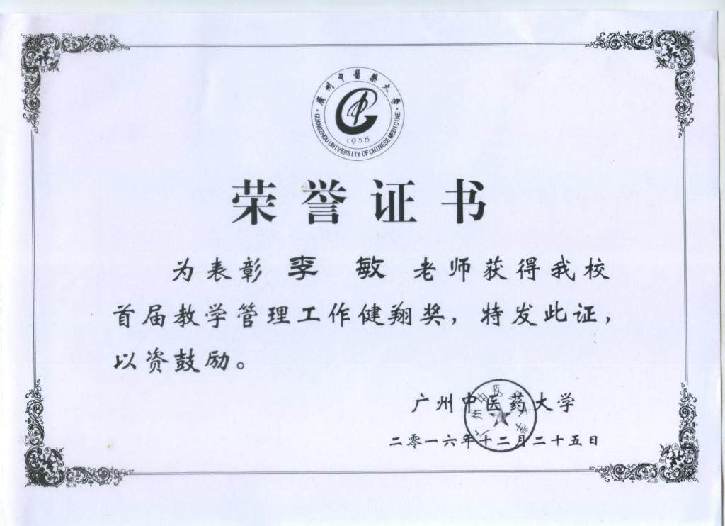 2016年荣获首届学校“教学管理健翔奖”。