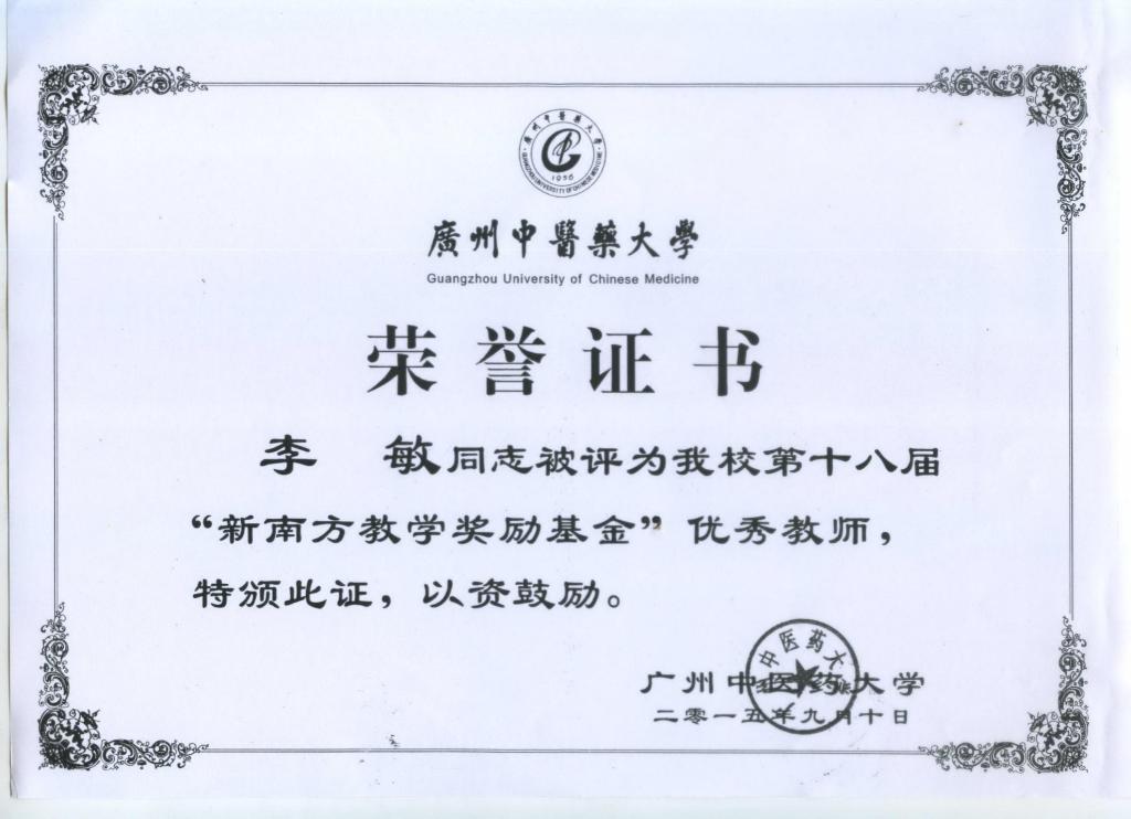 2015年荣获beat365官方网站第十八届“新南方教学奖励基金”优秀教师