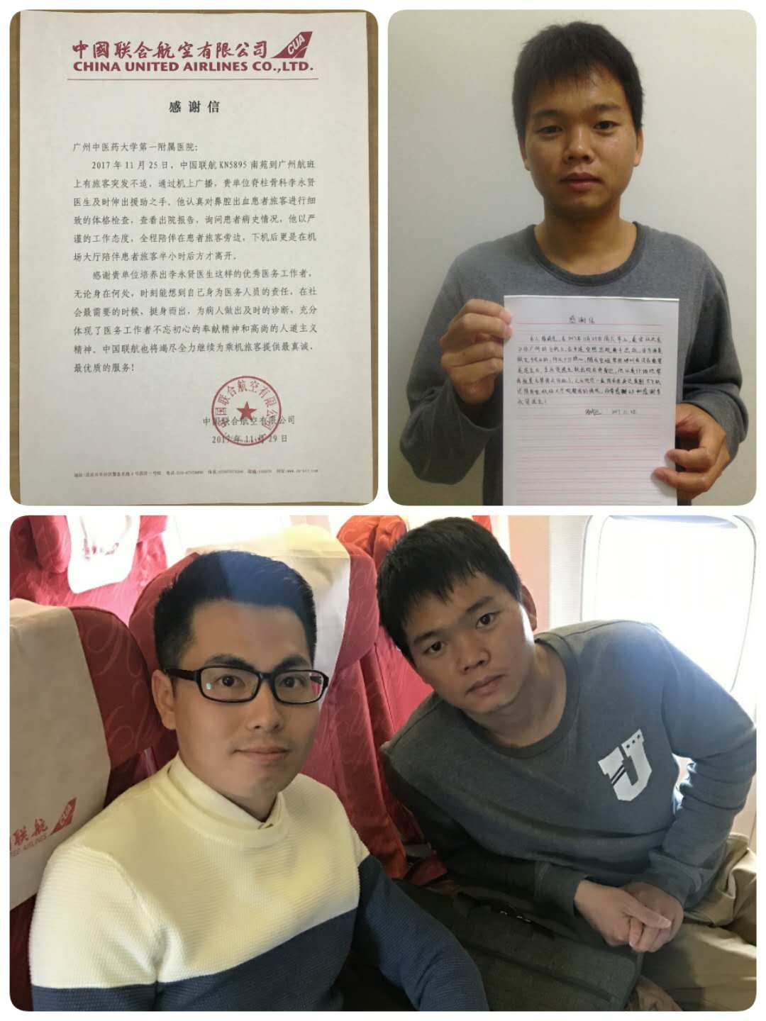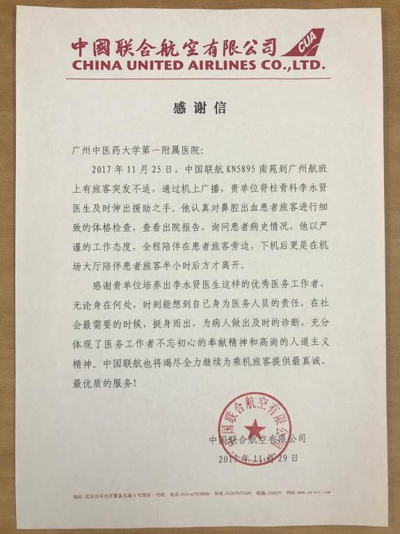 11月29日,我校第一附属医院收到中国联航寄来的感谢信,信中要感谢的对象是一附院脊柱骨科博士李永贤。原来,在11月25日上午,一名脑垂体腺瘤切除术后的患者在中联航KN5895航班上,突然出现鼻腔出血的紧急情况,同为该航班乘客的李永贤立刻伸出援手施救,使患者转危为安,也避免了飞机紧急迫降。