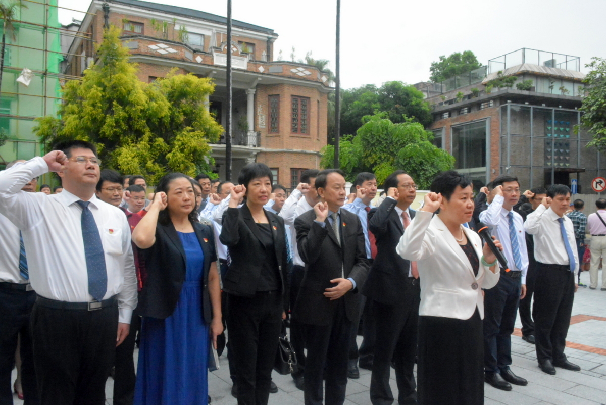随后,中心组成员来到中共三大会址遗址广场。94年前,中国共产党第三次全国代表大会在这里召开,广州市恤孤院后街31号从此载入党的光辉史册。这次大会统一了全党认识,使党能够团结一切可能联合的力量,共同完成民主革命任务。在广场鲜红的党旗前,由张建华领誓,中心组党员成员们举起右手,庄严宣誓,重温入党誓词。