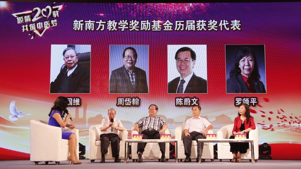 新南方教学奖励基金由著名校友朱拉伊于1997年创立,为感谢其对母校的杰出贡献,张建华代表学校将广东省书法家协会副主席陈春盛的作品赠予朱拉伊。穿插着精彩的歌舞表演,12位历届新南方教学奖励基金获奖代表上台接受访谈,其中包括禤国维教授、周岱翰教授两位国医大师,我校优秀教师陈蔚文、罗颂平、李赛美、全世建、蓝海、孙锋,优秀校友王锐旭、史俊恒、卢炎华、黄超原,他们的奋斗历程深深地感染了现场观众。